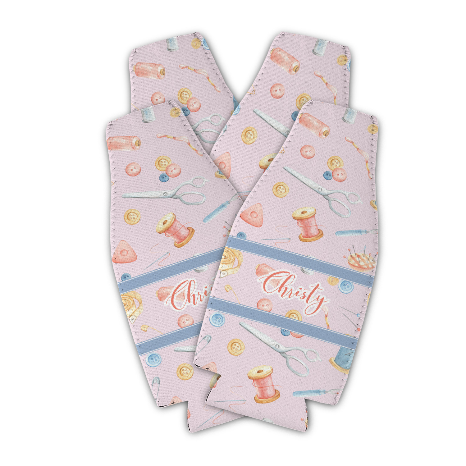 The design has a single pattern with a light pink background. The pattern is filled with sewing objects from needles to spools to pin cushions. The colors of the sewing objects include grey, light blue, peach, pink, and yellow. There are two ribbons going across the design that are a light grey-blue, accenting the similar color in the pattern. In between the two ribbons is where your personalization goes! On the coordinating design a textured grey-blue background is used, while a fun graphic of a pile of sewing items sits in the middle. Your personalization goes underneath.