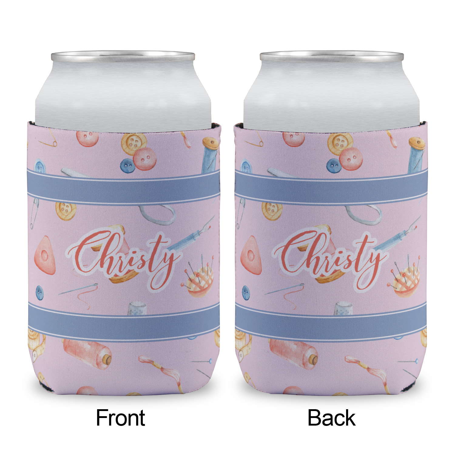 The design has a single pattern with a light pink background. The pattern is filled with sewing objects from needles to spools to pin cushions. The colors of the sewing objects include grey, light blue, peach, pink, and yellow. There are two ribbons going across the design that are a light grey-blue, accenting the similar color in the pattern. In between the two ribbons is where your personalization goes! On the coordinating design a textured grey-blue background is used, while a fun graphic of a pile of sewing items sits in the middle. Your personalization goes underneath.