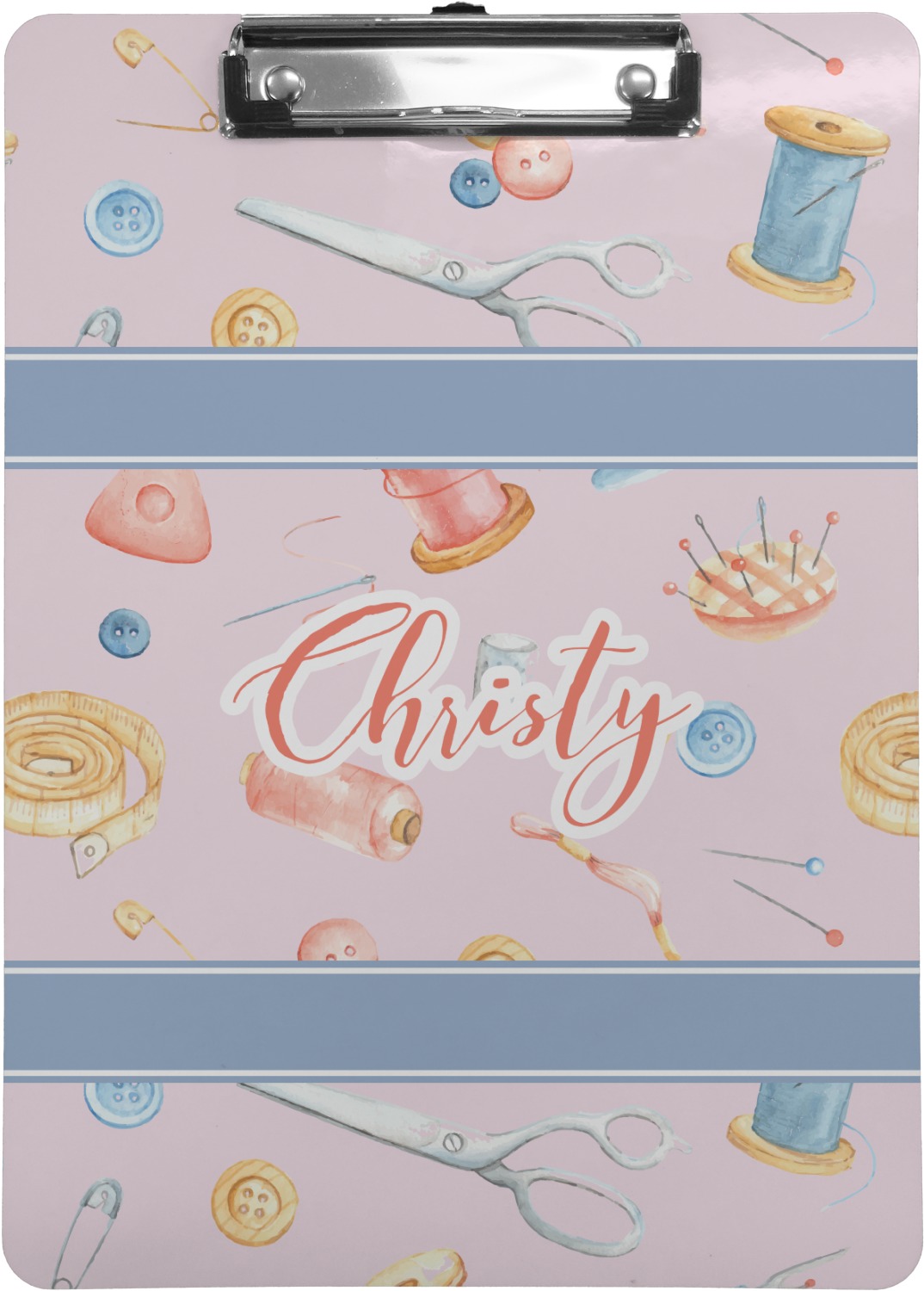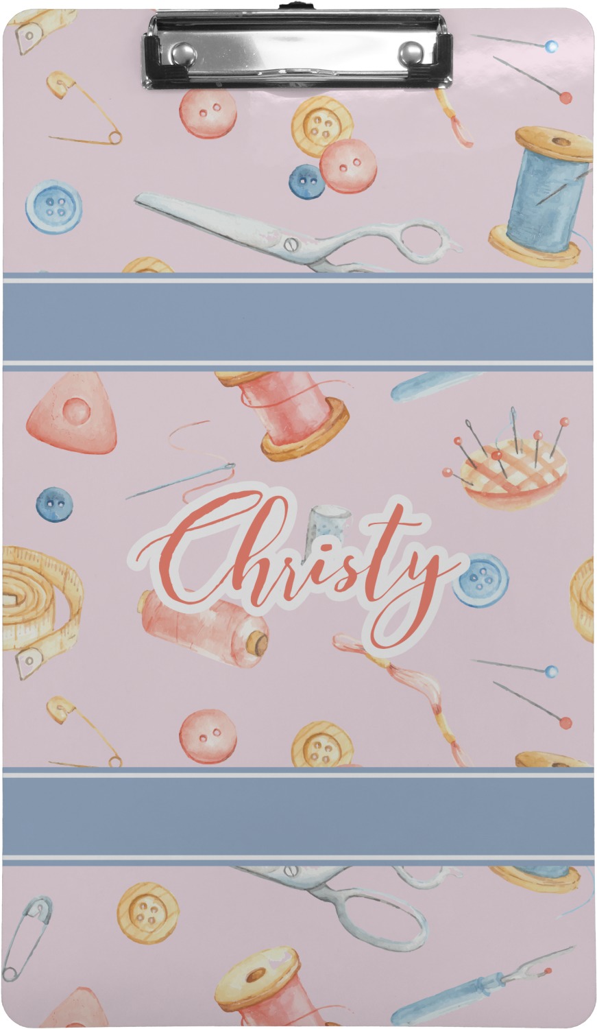 The design has a single pattern with a light pink background. The pattern is filled with sewing objects from needles to spools to pin cushions. The colors of the sewing objects include grey, light blue, peach, pink, and yellow. There are two ribbons going across the design that are a light grey-blue, accenting the similar color in the pattern. In between the two ribbons is where your personalization goes! On the coordinating design a textured grey-blue background is used, while a fun graphic of a pile of sewing items sits in the middle. Your personalization goes underneath.