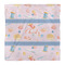 The design has a single pattern with a light pink background. The pattern is filled with sewing objects from needles to spools to pin cushions. The colors of the sewing objects include grey, light blue, peach, pink, and yellow. There are two ribbons going across the design that are a light grey-blue, accenting the similar color in the pattern. In between the two ribbons is where your personalization goes! On the coordinating design a textured grey-blue background is used, while a fun graphic of a pile of sewing items sits in the middle. Your personalization goes underneath.