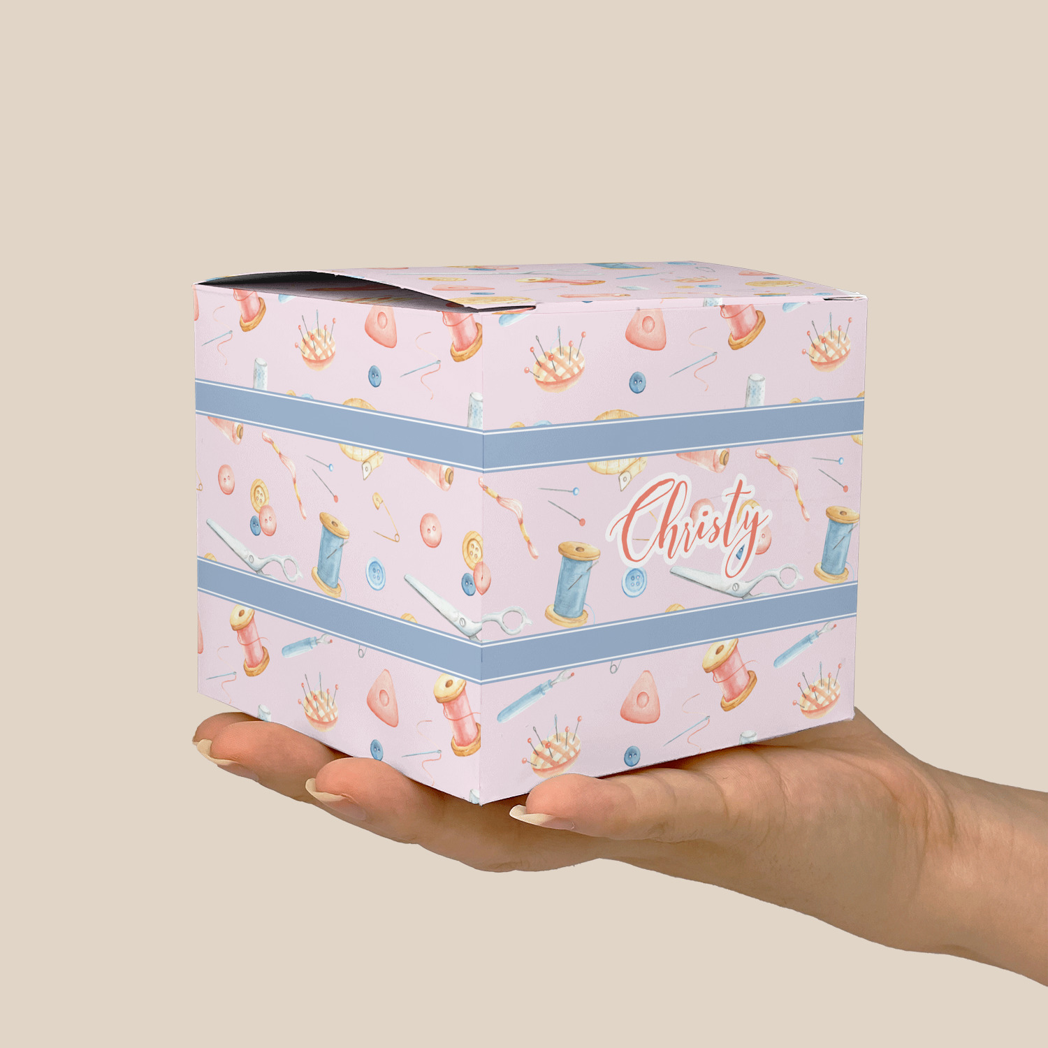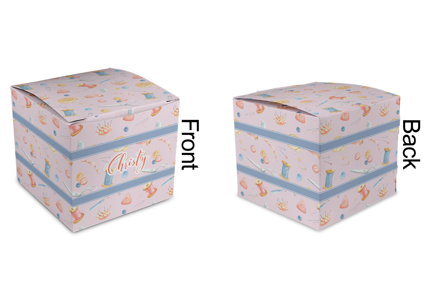 The design has a single pattern with a light pink background. The pattern is filled with sewing objects from needles to spools to pin cushions. The colors of the sewing objects include grey, light blue, peach, pink, and yellow. There are two ribbons going across the design that are a light grey-blue, accenting the similar color in the pattern. In between the two ribbons is where your personalization goes! On the coordinating design a textured grey-blue background is used, while a fun graphic of a pile of sewing items sits in the middle. Your personalization goes underneath.