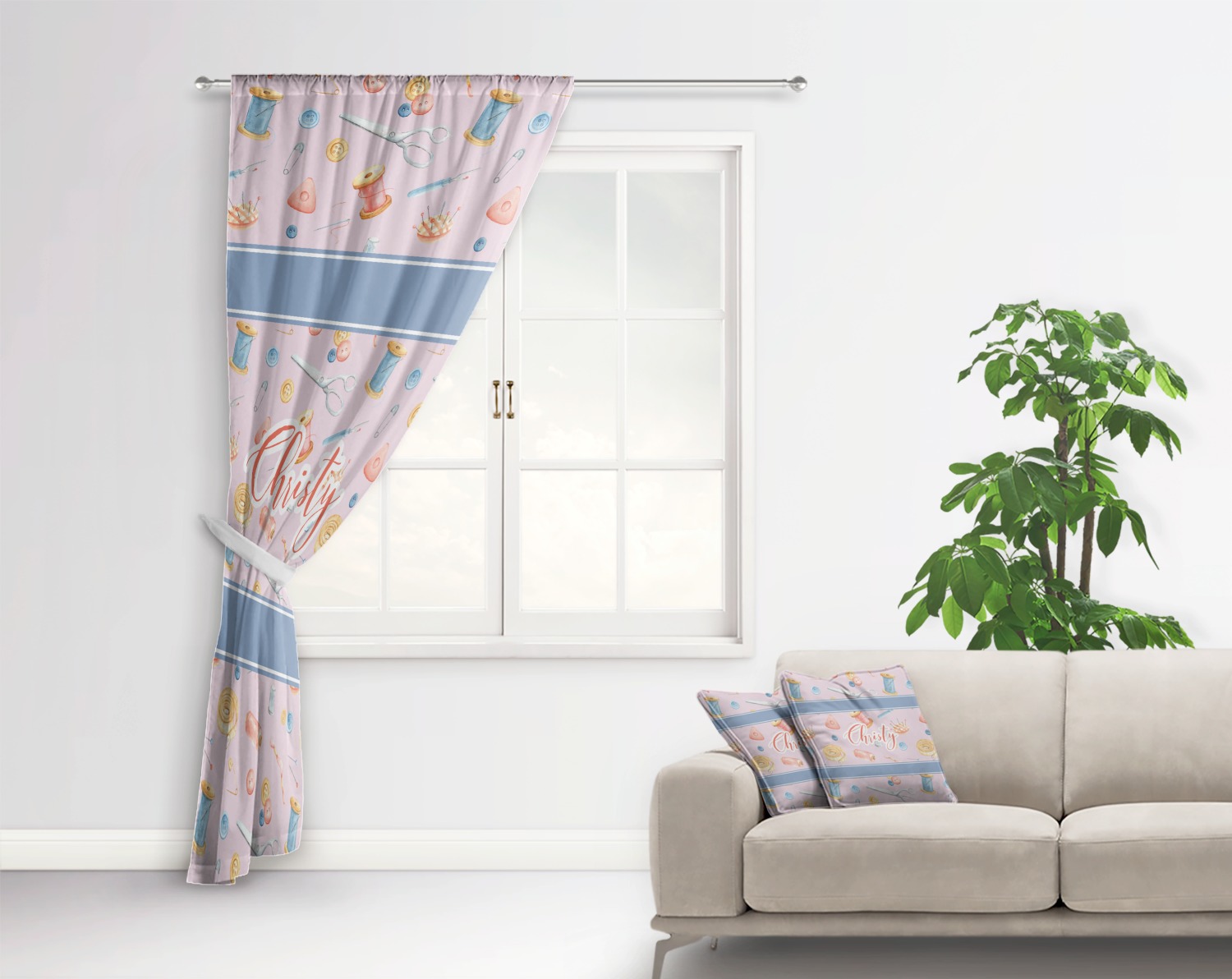 The design has a single pattern with a light pink background. The pattern is filled with sewing objects from needles to spools to pin cushions. The colors of the sewing objects include grey, light blue, peach, pink, and yellow. There are two ribbons going across the design that are a light grey-blue, accenting the similar color in the pattern. In between the two ribbons is where your personalization goes! On the coordinating design a textured grey-blue background is used, while a fun graphic of a pile of sewing items sits in the middle. Your personalization goes underneath.