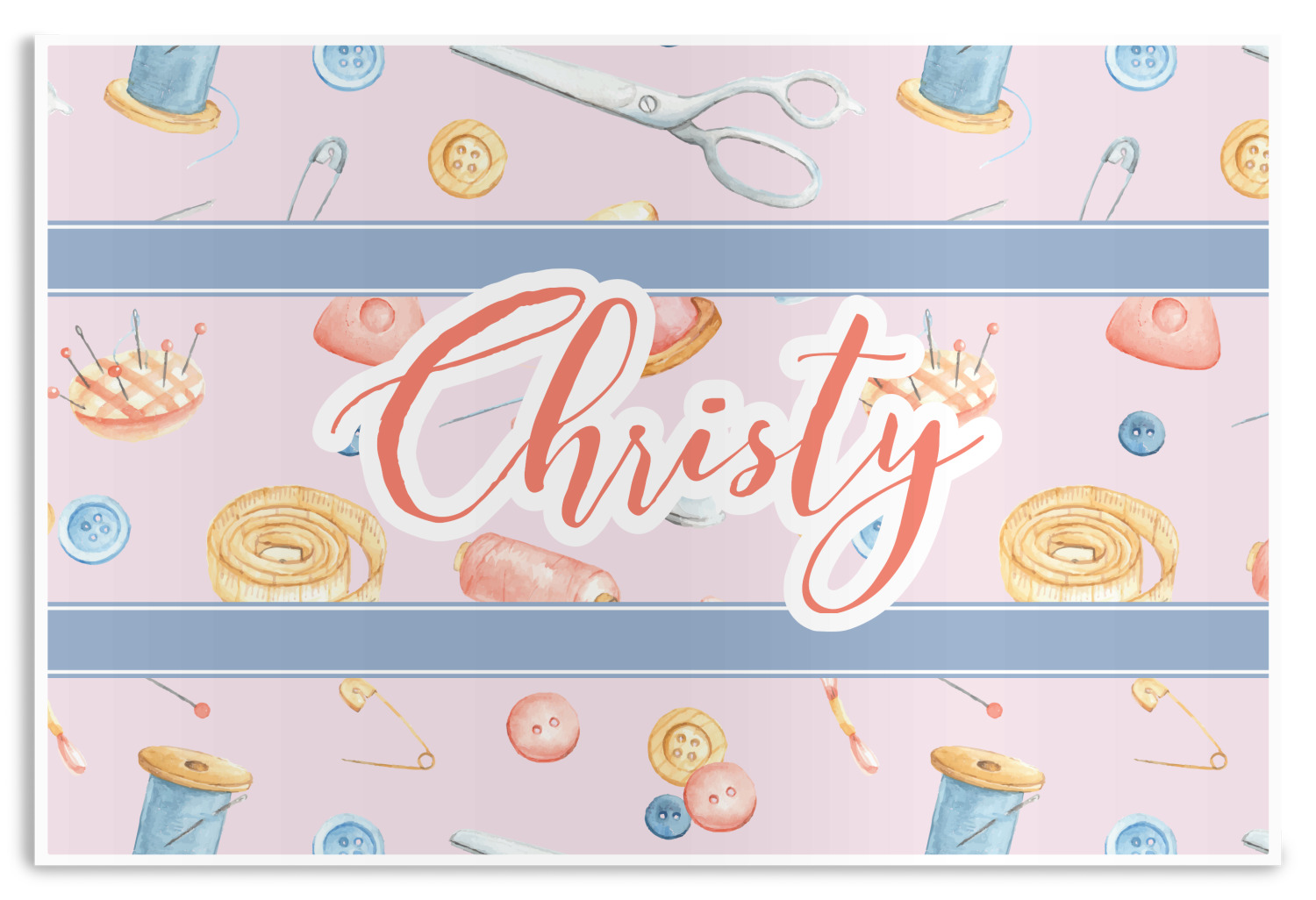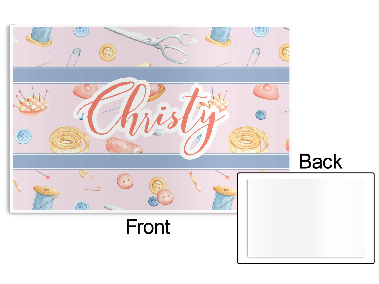 The design has a single pattern with a light pink background. The pattern is filled with sewing objects from needles to spools to pin cushions. The colors of the sewing objects include grey, light blue, peach, pink, and yellow. There are two ribbons going across the design that are a light grey-blue, accenting the similar color in the pattern. In between the two ribbons is where your personalization goes! On the coordinating design a textured grey-blue background is used, while a fun graphic of a pile of sewing items sits in the middle. Your personalization goes underneath.