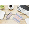 The design has a single pattern with a light pink background. The pattern is filled with sewing objects from needles to spools to pin cushions. The colors of the sewing objects include grey, light blue, peach, pink, and yellow. There are two ribbons going across the design that are a light grey-blue, accenting the similar color in the pattern. In between the two ribbons is where your personalization goes! On the coordinating design a textured grey-blue background is used, while a fun graphic of a pile of sewing items sits in the middle. Your personalization goes underneath.