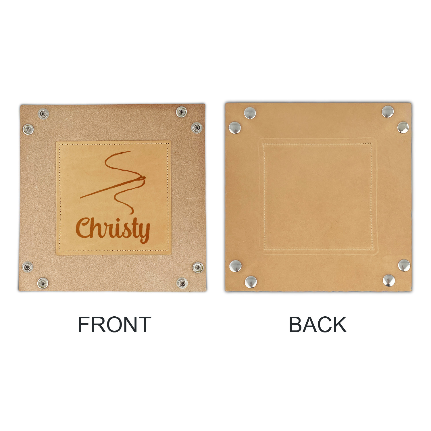 The design has a single pattern with a light pink background. The pattern is filled with sewing objects from needles to spools to pin cushions. The colors of the sewing objects include grey, light blue, peach, pink, and yellow. There are two ribbons going across the design that are a light grey-blue, accenting the similar color in the pattern. In between the two ribbons is where your personalization goes! On the coordinating design a textured grey-blue background is used, while a fun graphic of a pile of sewing items sits in the middle. Your personalization goes underneath.