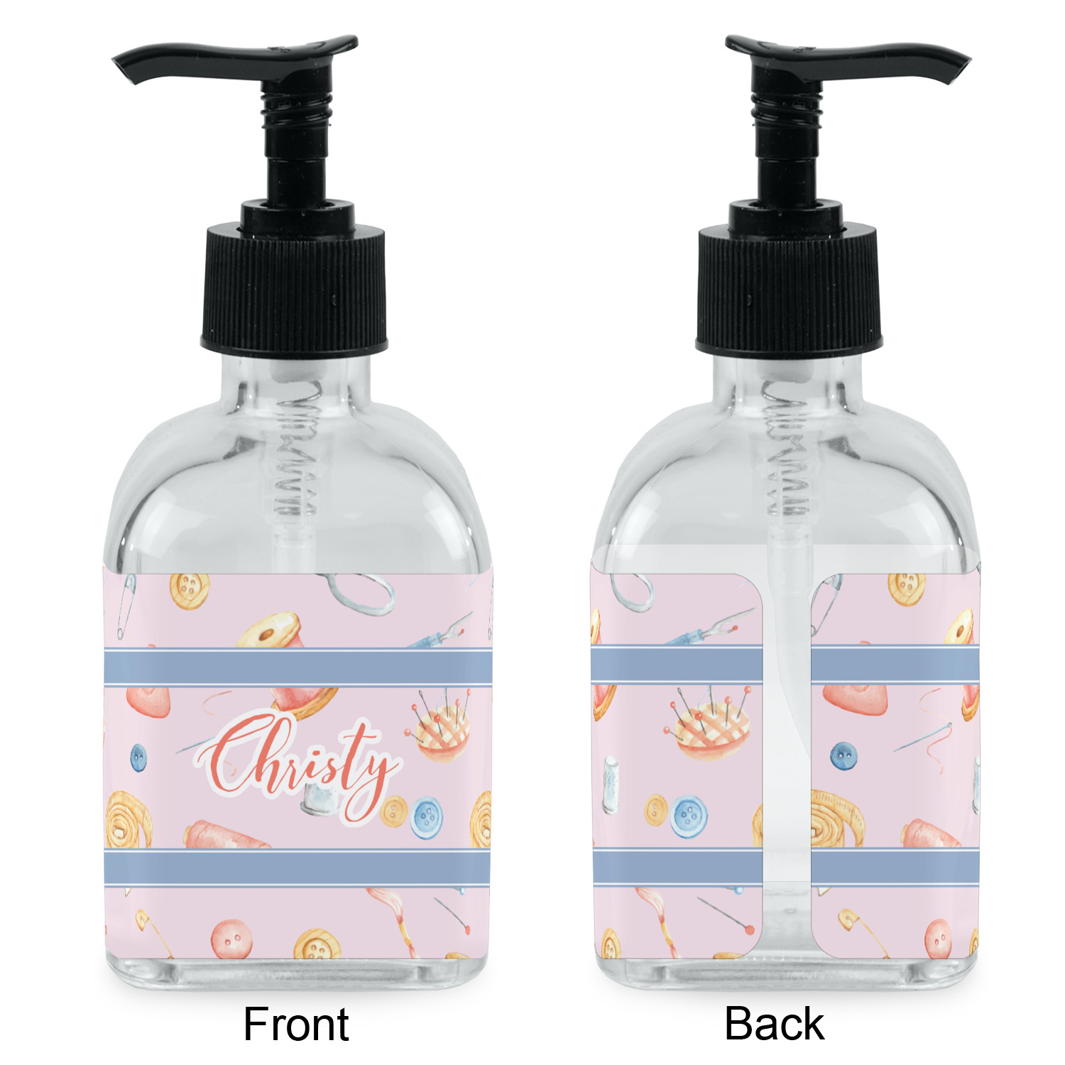 Crafted from a high-quality glass, these soap dispensers and lotion dispensers are durable and robust, while still looking elegant. They are sold with black pumps. Each soap dispenser pump measures at 6.5 by 2.25 inches. On these soap pumps, we display your customized design on a personalized vinyl adhesive on three sides. That way, you can judge how much liquid is in the bottles from the back.