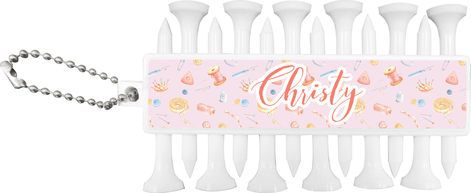 With 12 tees on a lightweight, portable key chain, it almost ensures a great 18 holes. Our tees are made of white plastic and are a little over 2". Design the front and the back of the golf tee holder. Pick from over a hundred designs, colors, and personalization styles! The set even comes with three removable ball markers as well!