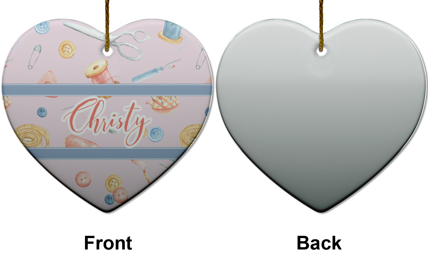 The design has a single pattern with a light pink background. The pattern is filled with sewing objects from needles to spools to pin cushions. The colors of the sewing objects include grey, light blue, peach, pink, and yellow. There are two ribbons going across the design that are a light grey-blue, accenting the similar color in the pattern. In between the two ribbons is where your personalization goes! On the coordinating design a textured grey-blue background is used, while a fun graphic of a pile of sewing items sits in the middle. Your personalization goes underneath.