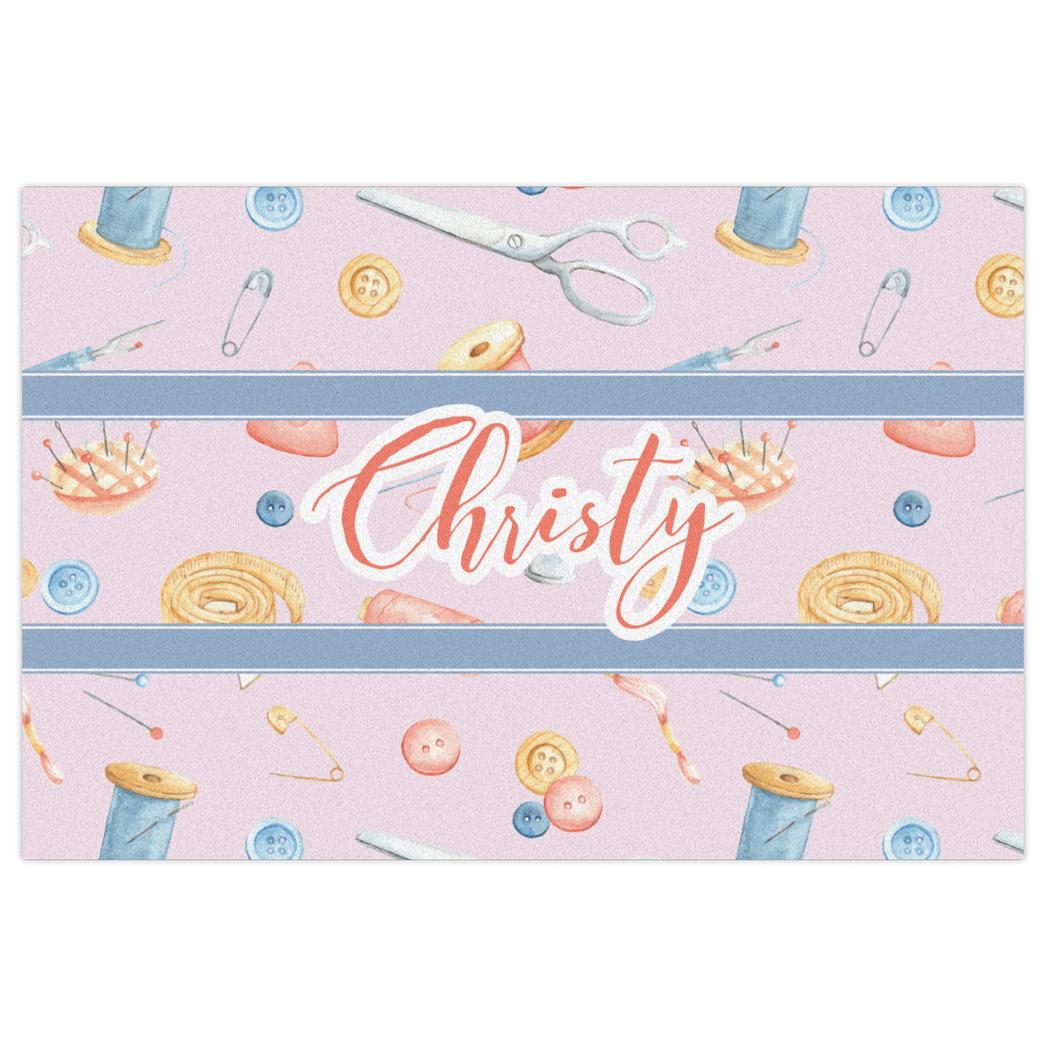 The design has a single pattern with a light pink background. The pattern is filled with sewing objects from needles to spools to pin cushions. The colors of the sewing objects include grey, light blue, peach, pink, and yellow. There are two ribbons going across the design that are a light grey-blue, accenting the similar color in the pattern. In between the two ribbons is where your personalization goes! On the coordinating design a textured grey-blue background is used, while a fun graphic of a pile of sewing items sits in the middle. Your personalization goes underneath.