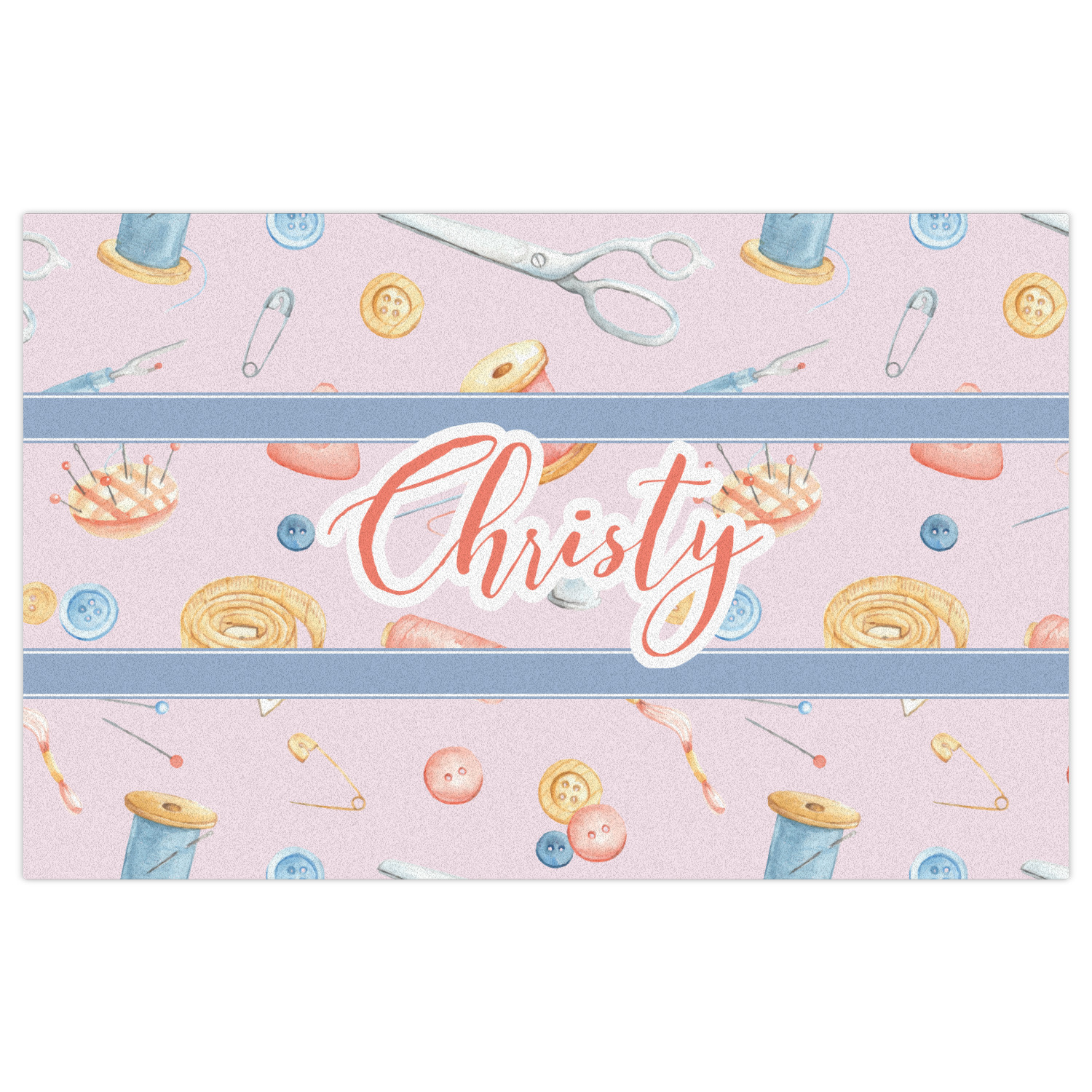 The design has a single pattern with a light pink background. The pattern is filled with sewing objects from needles to spools to pin cushions. The colors of the sewing objects include grey, light blue, peach, pink, and yellow. There are two ribbons going across the design that are a light grey-blue, accenting the similar color in the pattern. In between the two ribbons is where your personalization goes! On the coordinating design a textured grey-blue background is used, while a fun graphic of a pile of sewing items sits in the middle. Your personalization goes underneath.