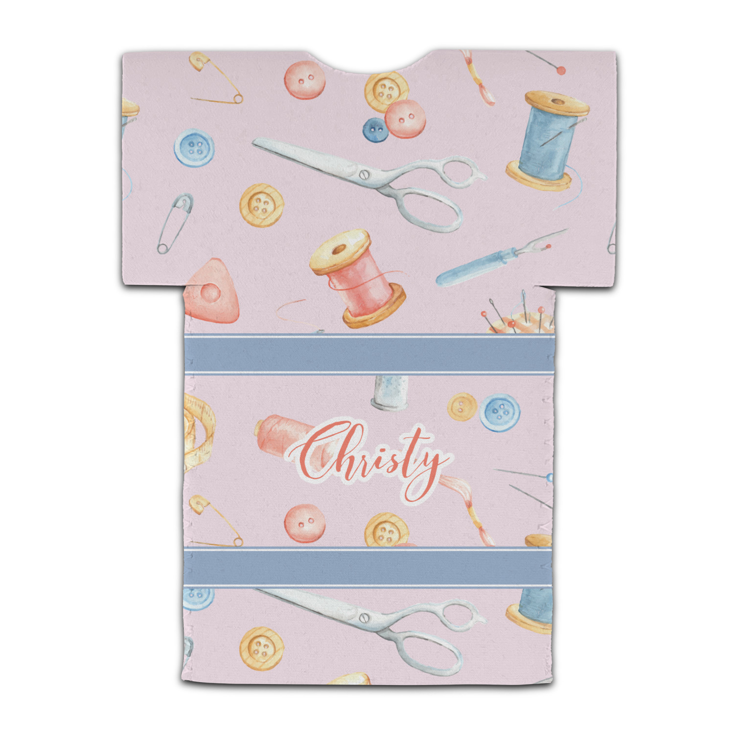 The design has a single pattern with a light pink background. The pattern is filled with sewing objects from needles to spools to pin cushions. The colors of the sewing objects include grey, light blue, peach, pink, and yellow. There are two ribbons going across the design that are a light grey-blue, accenting the similar color in the pattern. In between the two ribbons is where your personalization goes! On the coordinating design a textured grey-blue background is used, while a fun graphic of a pile of sewing items sits in the middle. Your personalization goes underneath.