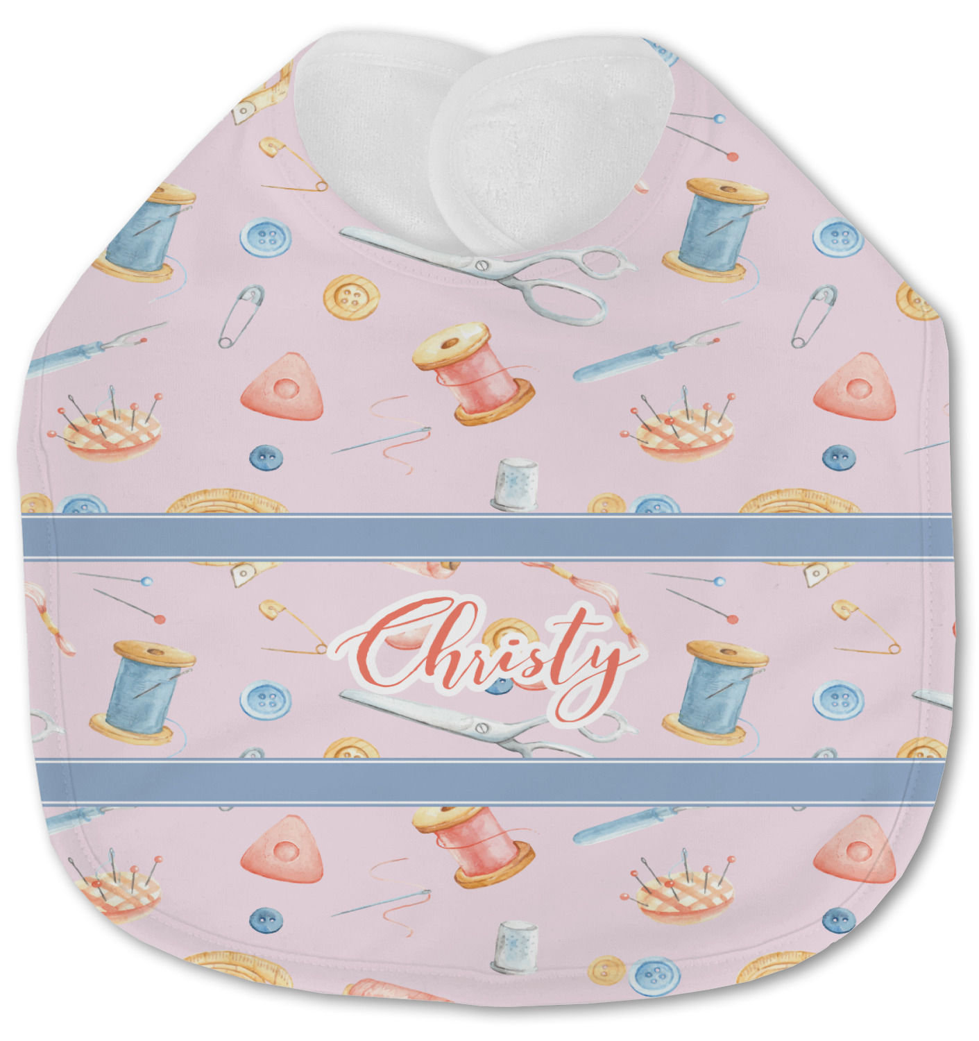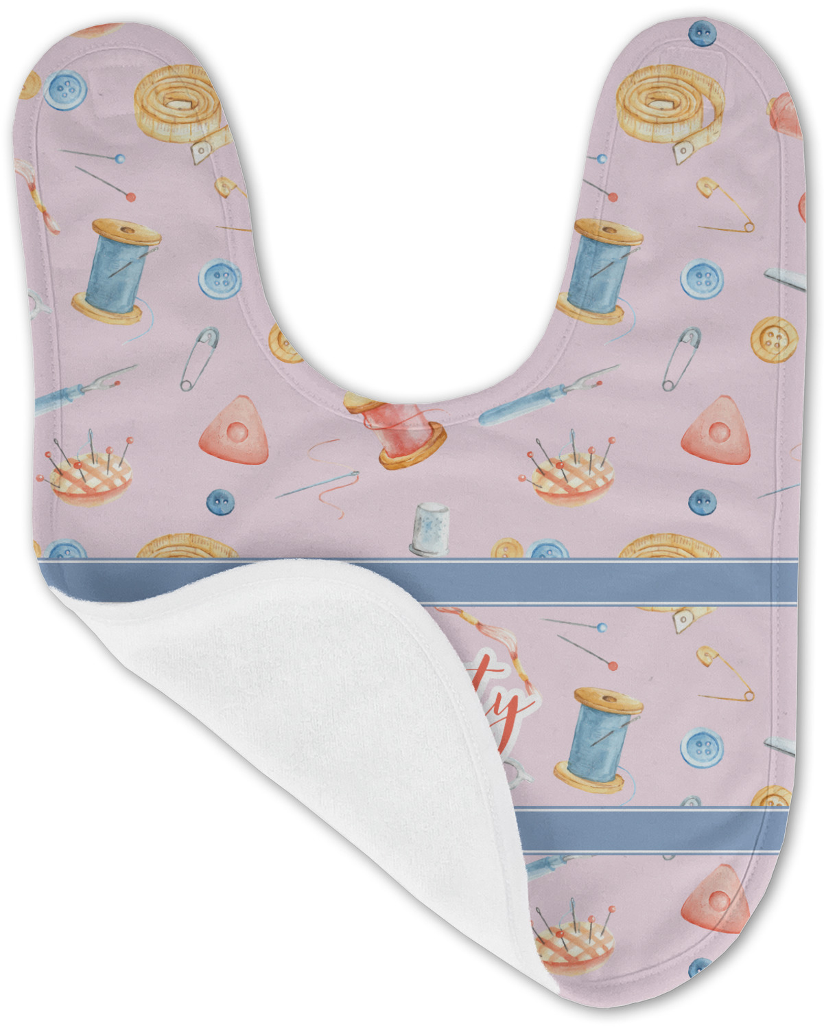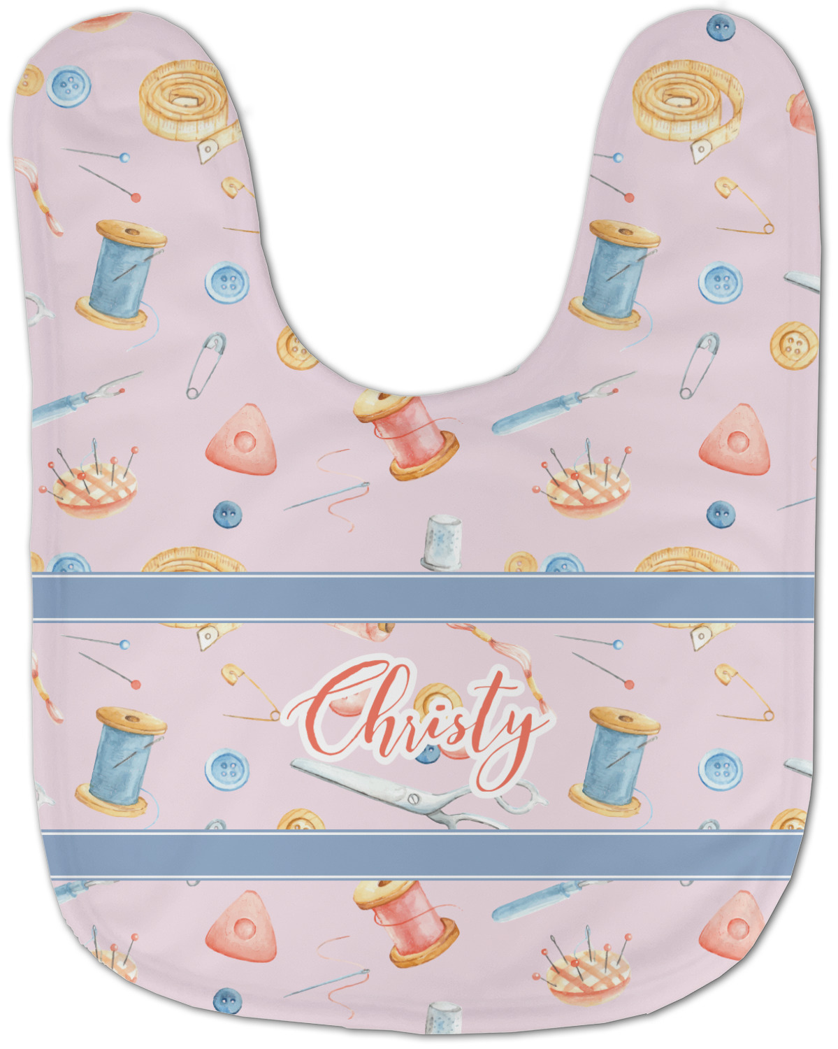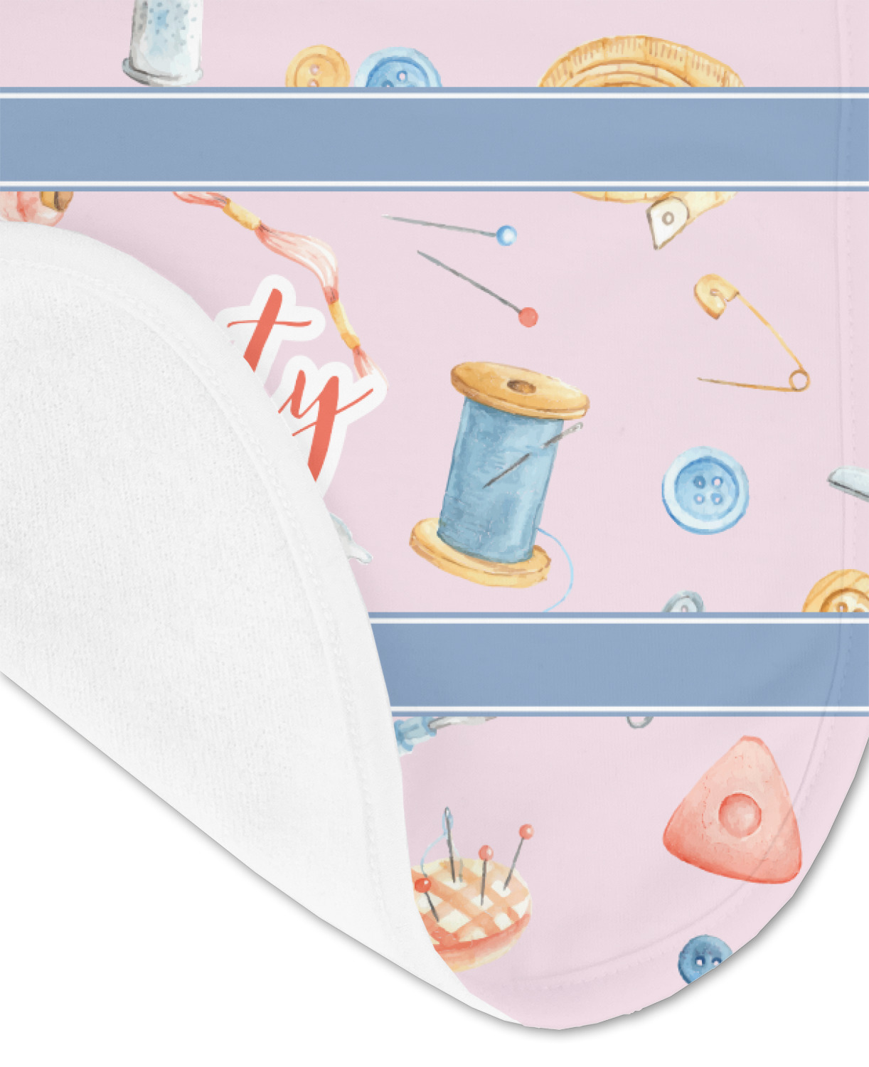 The design has a single pattern with a light pink background. The pattern is filled with sewing objects from needles to spools to pin cushions. The colors of the sewing objects include grey, light blue, peach, pink, and yellow. There are two ribbons going across the design that are a light grey-blue, accenting the similar color in the pattern. In between the two ribbons is where your personalization goes! On the coordinating design a textured grey-blue background is used, while a fun graphic of a pile of sewing items sits in the middle. Your personalization goes underneath.