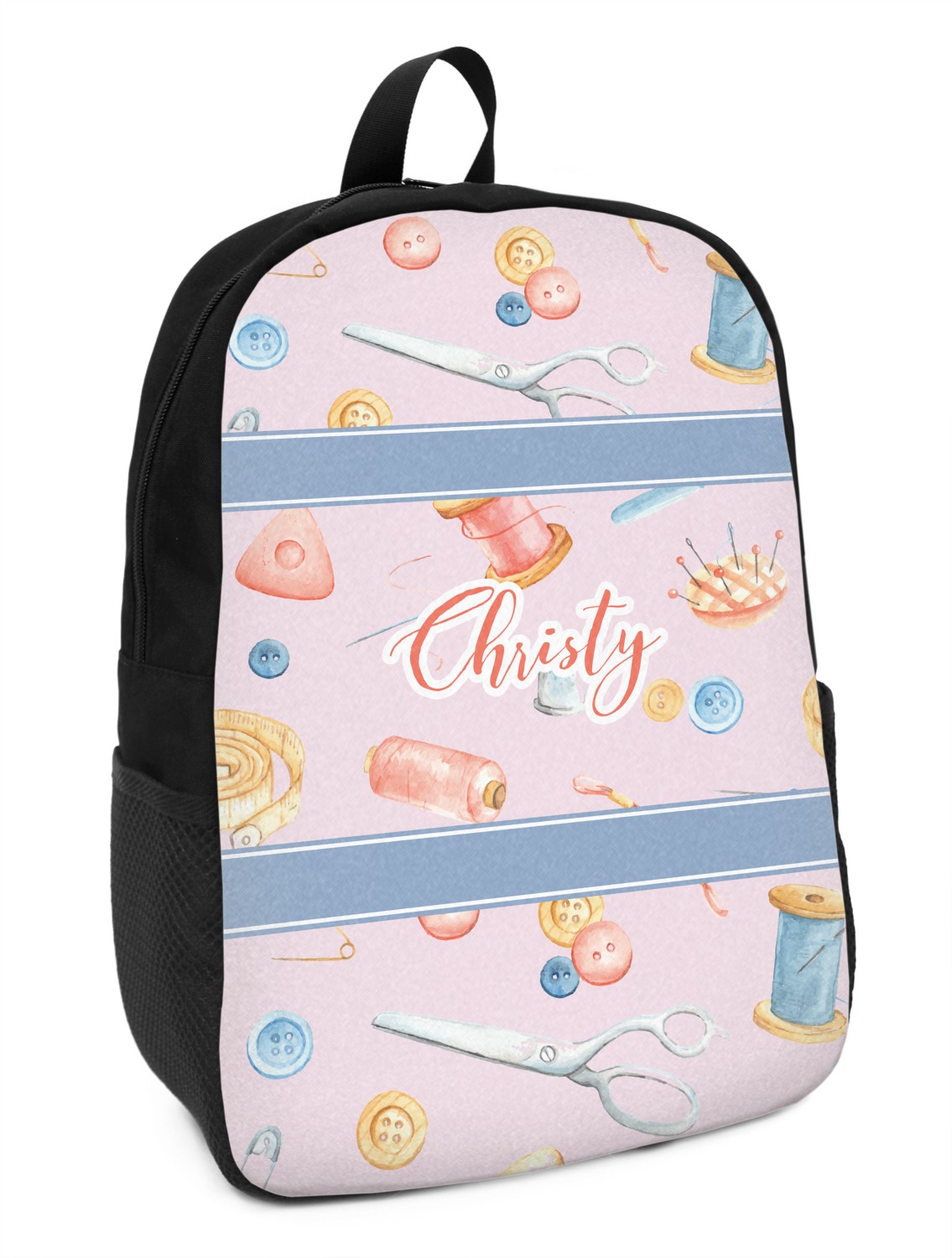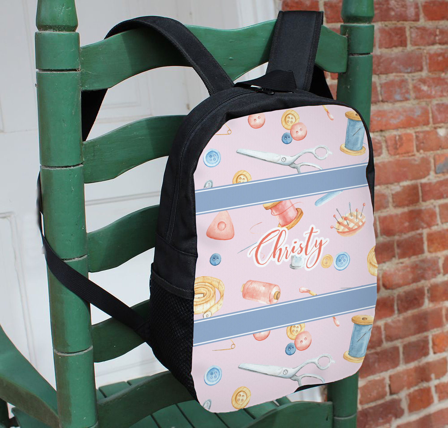 These small backpacks are made of a durable black canvas material with your personalization right on the front. The two shoulder straps are padded and easily adjustable. The bag itself measures at about 11" W x 15" H x 5" D. It's the perfect size for elementary aged kids or adults who want a smaller backpack. On the top of the bag you will find a handle to hang or carry your backpack by as well as a large zipper closure to keep all of your belongings safe inside. On each side of your backpack is a mesh pocket for a small item or water bottle. Inside your backpack you will find a spacious area with a small zipper pocket and a padded laptop slot that will fit up to a 13" laptop (13" being very snug). This is the perfect bag for any student that needs a couple books and their laptop with them at all times. It also works great as a carry on for traveling!