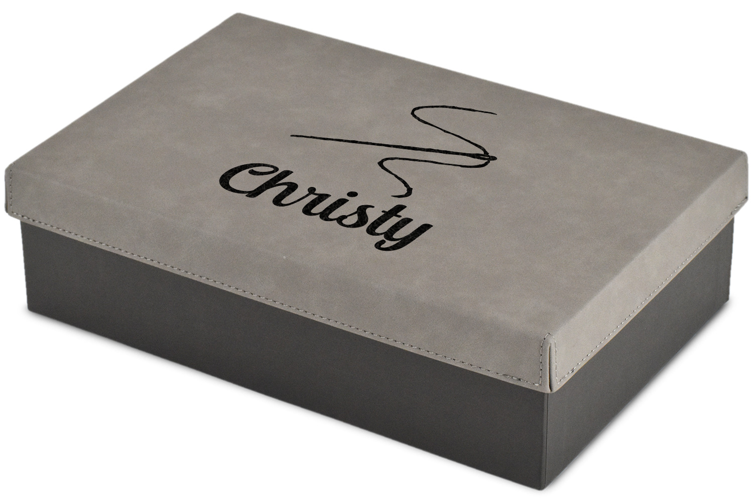 These gift boxes are available in 3 different sizes to accommodate various sized gifts. Available in gray as a neutral color for any occasion as well as to showcase your design boldly. Engraved with a laser this high quality paper board and faux leather gift box is unique and makes any gift stand out.