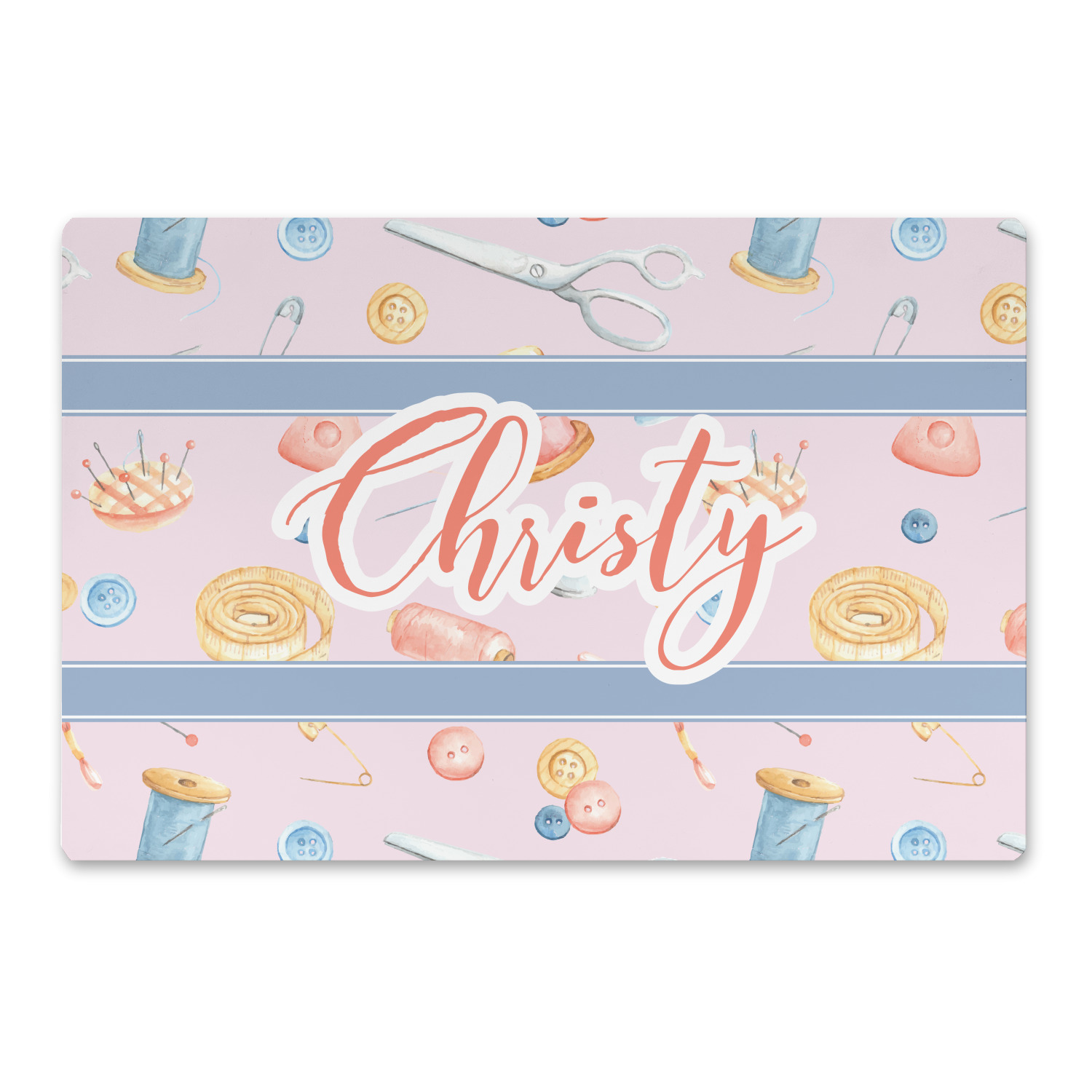 The design has a single pattern with a light pink background. The pattern is filled with sewing objects from needles to spools to pin cushions. The colors of the sewing objects include grey, light blue, peach, pink, and yellow. There are two ribbons going across the design that are a light grey-blue, accenting the similar color in the pattern. In between the two ribbons is where your personalization goes! On the coordinating design a textured grey-blue background is used, while a fun graphic of a pile of sewing items sits in the middle. Your personalization goes underneath.