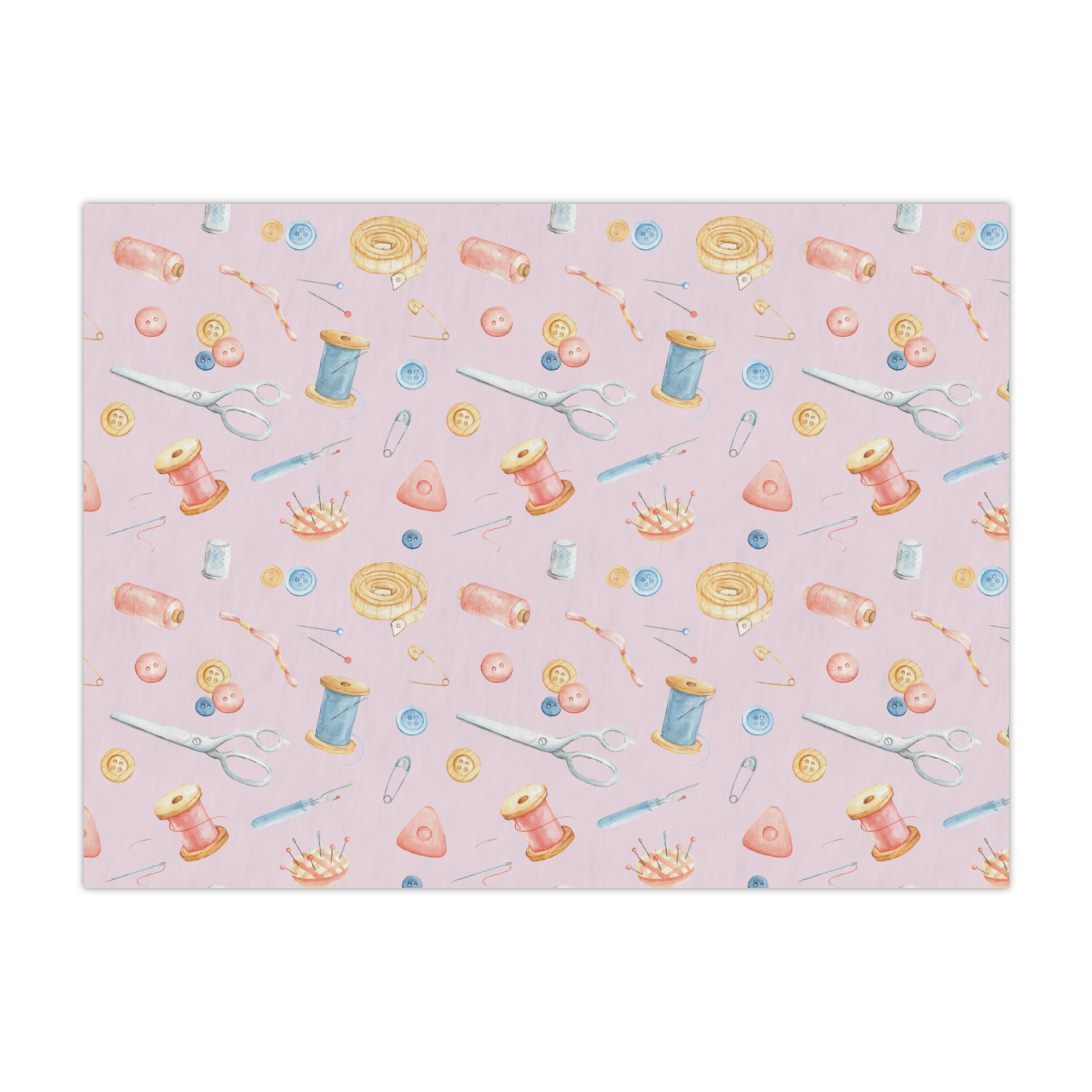 The design has a single pattern with a light pink background. The pattern is filled with sewing objects from needles to spools to pin cushions. The colors of the sewing objects include grey, light blue, peach, pink, and yellow. There are two ribbons going across the design that are a light grey-blue, accenting the similar color in the pattern. In between the two ribbons is where your personalization goes! On the coordinating design a textured grey-blue background is used, while a fun graphic of a pile of sewing items sits in the middle. Your personalization goes underneath.