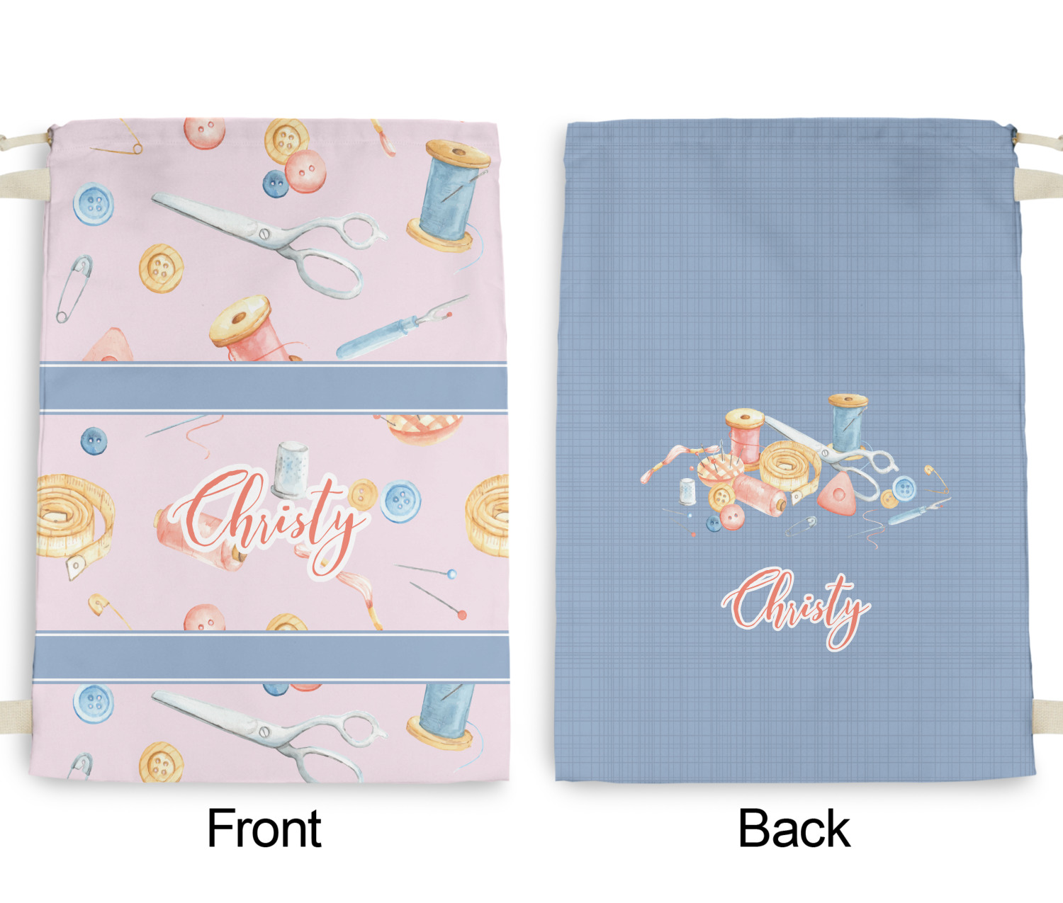 Carry your laundry in style with these customized laundry bags. Available in two sizes, featuring a natural colored woven strap and a cinch cord, these bags hold a lot of clothes or anything else you want to fit in them.
