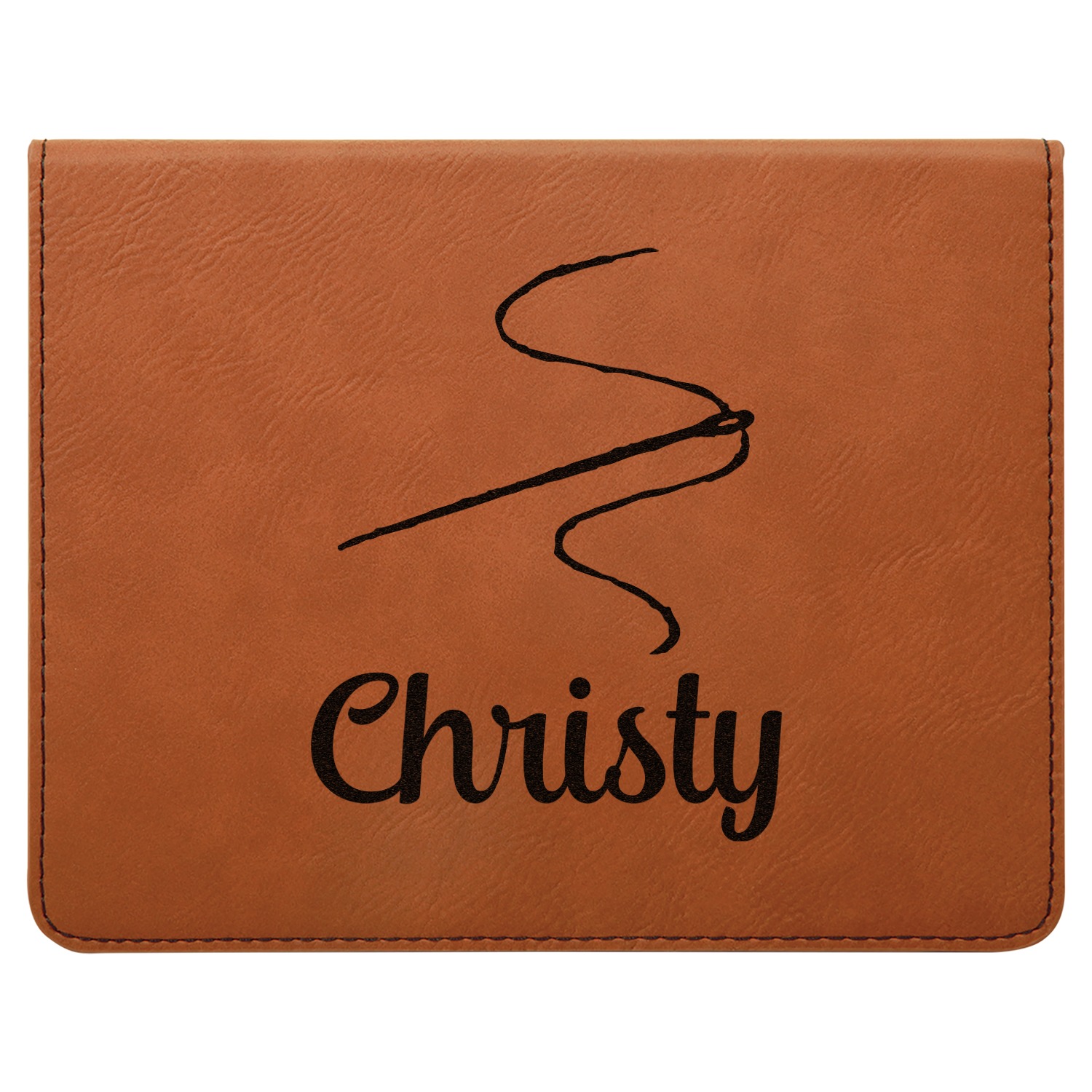 This set includes a wine stopper, pourer, drip ring, and a corkscrew! The exterior of the box is a gorgeous, cognac-brown leatherette, while the interior is covered in a black, velvety material. Four foam indentations, unique to the shape of the wine tool, are found at the bottom half of the box's interior. The tools fit snugly into each of their designated spots, and the foam material helps to protect the integrity of your tools. Each of the wine gadgets features a bamboo accent, with the location and style depending on the tool itself. We laser engrave your personalized design onto the lid of the box, which easily flips open and is secured closed by a small magnet. The wine accessories box measures at 7 by 5.5 inches in total.