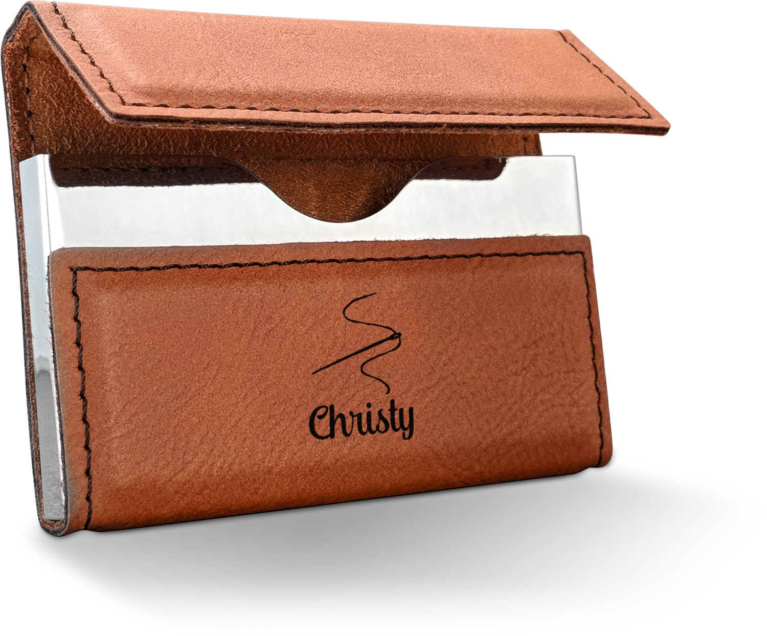 Your personalized design is laser engraved onto either the front, or the front and back of the card holder, depending on the model you purchase. Once engraved, the design will appear a darkened black against the cognac color of the leatherette.