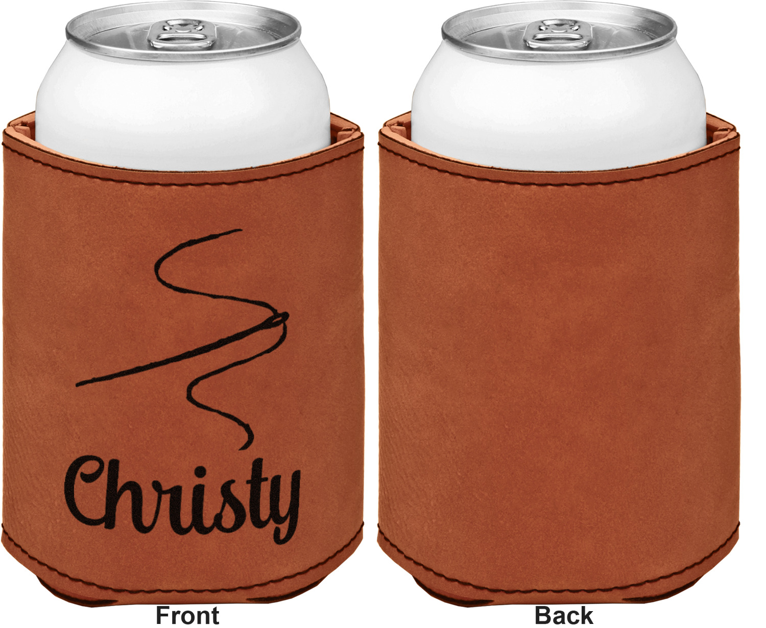 This can sleeve is made from a cognac-brown leatherette and stitched with a sturdy, black thread. A slim padding lines the inside of your can sleeve to allow for a better fit once your drink is inserted. The sleeve itself measures at 4 by 4.5 inches, allowing this custom can sleeve to accommodate most canned drinks. Your personalized design can be engraved on the front and back, or solely the front. When laser-engraved, your design appears as a black coloration which contrasts the leatherette nicely.