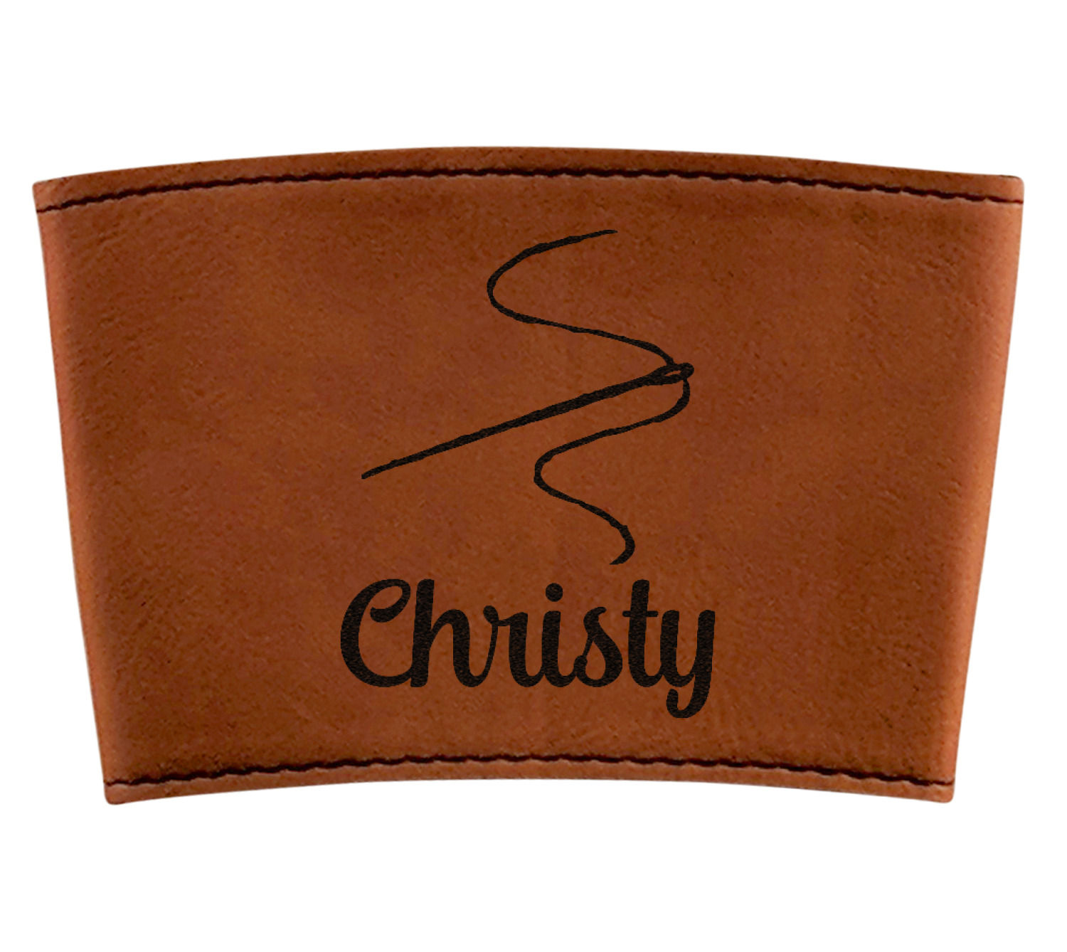 This cup sleeve is made from a suave, cognac-brown leatherette and finished with an intricate, black stitch. The interior of this can sleeve is fabricated from a thin foam material to help insulate your mug's contents. The sleeve is specifically made to suit tapered glasses or mugs, so the top's diameter is 3.5 inches, while the bottom's diameter is 2.75 inches. Your customized design will be laser engraved into the leatherette, leaving behind crisp, black imprint. With these products, we provide you with the option of engraving the front and back, or the front only.
