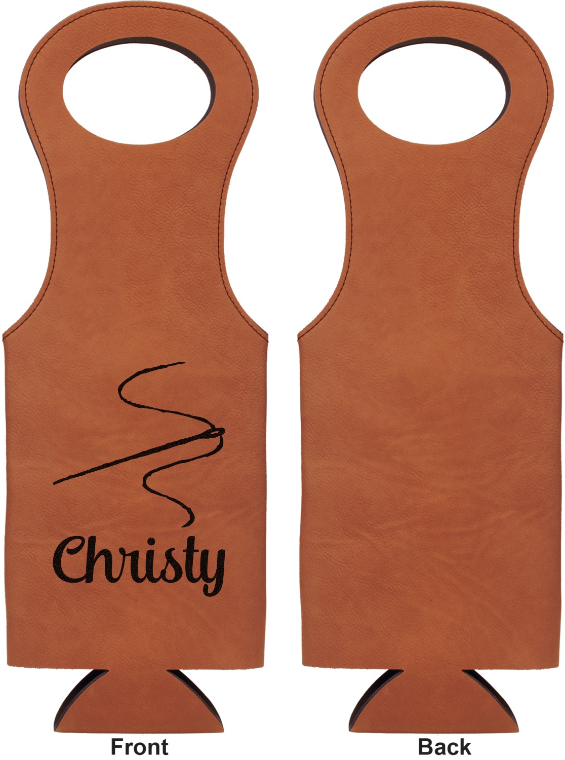This wine carrier is made from a stunning leatherette, in a cognac-brown color. Strong, black stitching lines the sides of your wine bottle bag and provides extra durability. The interior is lined with a padded, black material to allow for a snug fit once your bottle is placed inside. At the top of this wine gift bag, you'll find two oval shaped handles that elegantly complements the rest of the bag's style. We provide you with the option of laser-engraving the front, or the front and back of your new personalized wine bag!