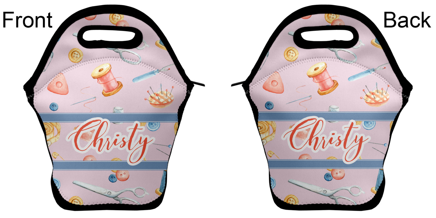 Our personalized lunch bags are made from a strong neoprene, and secure with a zipper closure that lines the top of the bag.The edges of the neoprene are sewn together with a heavy duty stitch, adding to the durability of the bag. The is accompanied by a reinforced handle at its top, for the easy transport of your lunch. We display your personalization across both the front and back of this neoprene lunch bag, while the remaining sides are a sleek black in color. Each bag measures at 13.5 inches tall, and 11.5 inches wide.