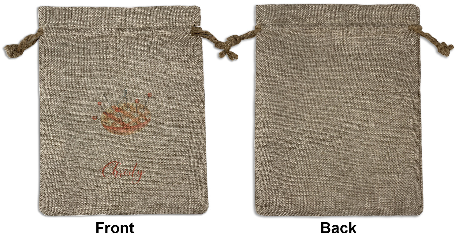 We sell our Burlap Gift Bags in 3 variant sized bags. Made with burlap polyester, each personalized bag can be secured with a twine drawstring pull. Your custom design is available to print on one side or both sides - completely up to you! The sizes of the bags measure approximately 4.5" x 6.5" for the smallest size, 6.5" x 8.0" for the medium size, and 6.5" x 13.5" for the large-sized bag.