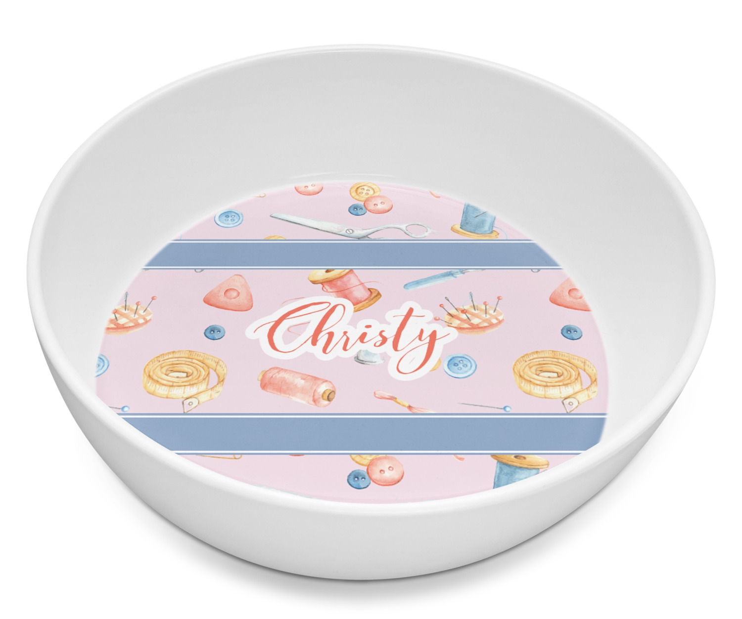 The design has a single pattern with a light pink background. The pattern is filled with sewing objects from needles to spools to pin cushions. The colors of the sewing objects include grey, light blue, peach, pink, and yellow. There are two ribbons going across the design that are a light grey-blue, accenting the similar color in the pattern. In between the two ribbons is where your personalization goes! On the coordinating design a textured grey-blue background is used, while a fun graphic of a pile of sewing items sits in the middle. Your personalization goes underneath.