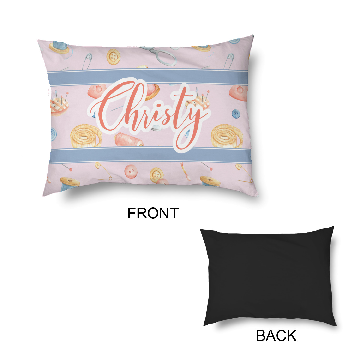 The design has a single pattern with a light pink background. The pattern is filled with sewing objects from needles to spools to pin cushions. The colors of the sewing objects include grey, light blue, peach, pink, and yellow. There are two ribbons going across the design that are a light grey-blue, accenting the similar color in the pattern. In between the two ribbons is where your personalization goes! On the coordinating design a textured grey-blue background is used, while a fun graphic of a pile of sewing items sits in the middle. Your personalization goes underneath.