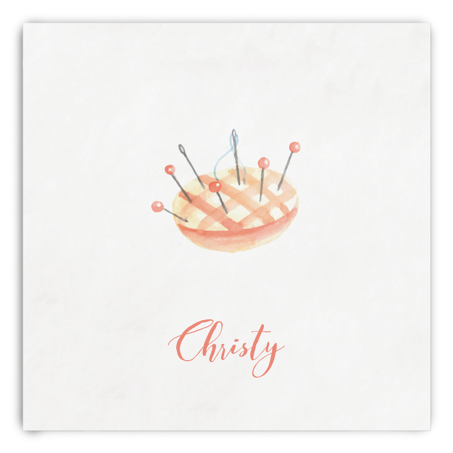 The design has a single pattern with a light pink background. The pattern is filled with sewing objects from needles to spools to pin cushions. The colors of the sewing objects include grey, light blue, peach, pink, and yellow. There are two ribbons going across the design that are a light grey-blue, accenting the similar color in the pattern. In between the two ribbons is where your personalization goes! On the coordinating design a textured grey-blue background is used, while a fun graphic of a pile of sewing items sits in the middle. Your personalization goes underneath.