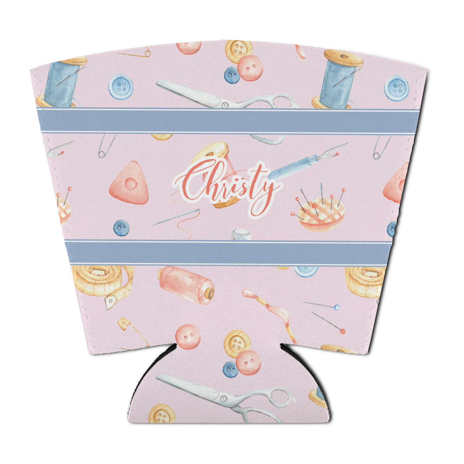 The design has a single pattern with a light pink background. The pattern is filled with sewing objects from needles to spools to pin cushions. The colors of the sewing objects include grey, light blue, peach, pink, and yellow. There are two ribbons going across the design that are a light grey-blue, accenting the similar color in the pattern. In between the two ribbons is where your personalization goes! On the coordinating design a textured grey-blue background is used, while a fun graphic of a pile of sewing items sits in the middle. Your personalization goes underneath.