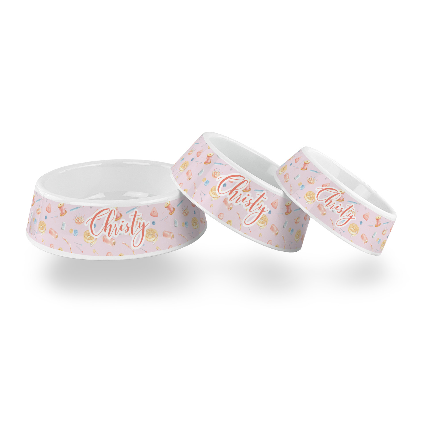 The design has a single pattern with a light pink background. The pattern is filled with sewing objects from needles to spools to pin cushions. The colors of the sewing objects include grey, light blue, peach, pink, and yellow. There are two ribbons going across the design that are a light grey-blue, accenting the similar color in the pattern. In between the two ribbons is where your personalization goes! On the coordinating design a textured grey-blue background is used, while a fun graphic of a pile of sewing items sits in the middle. Your personalization goes underneath.