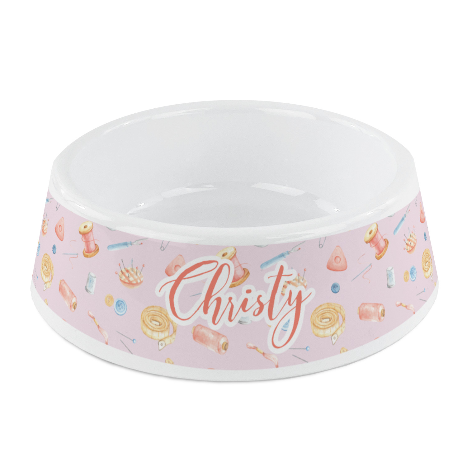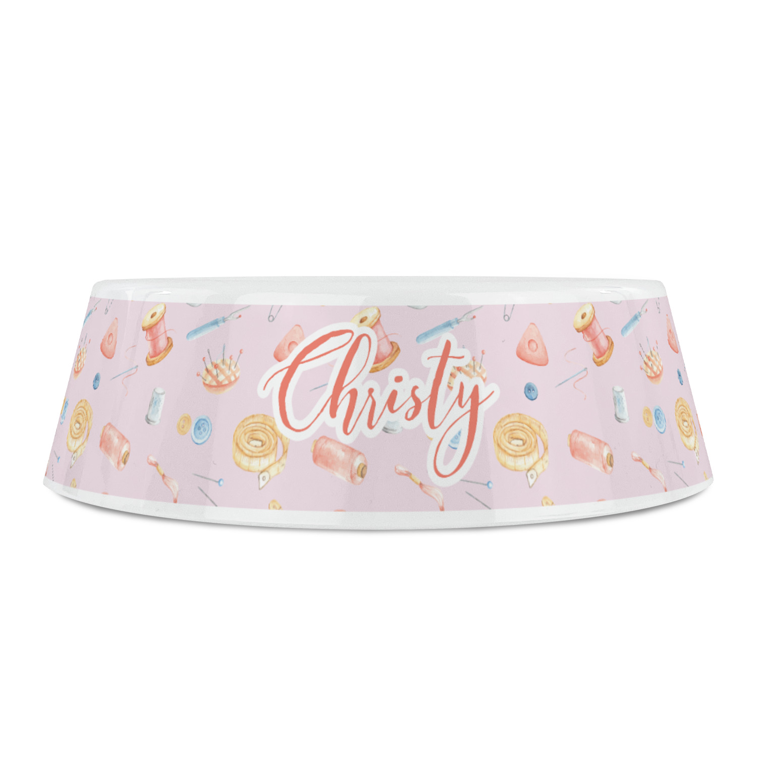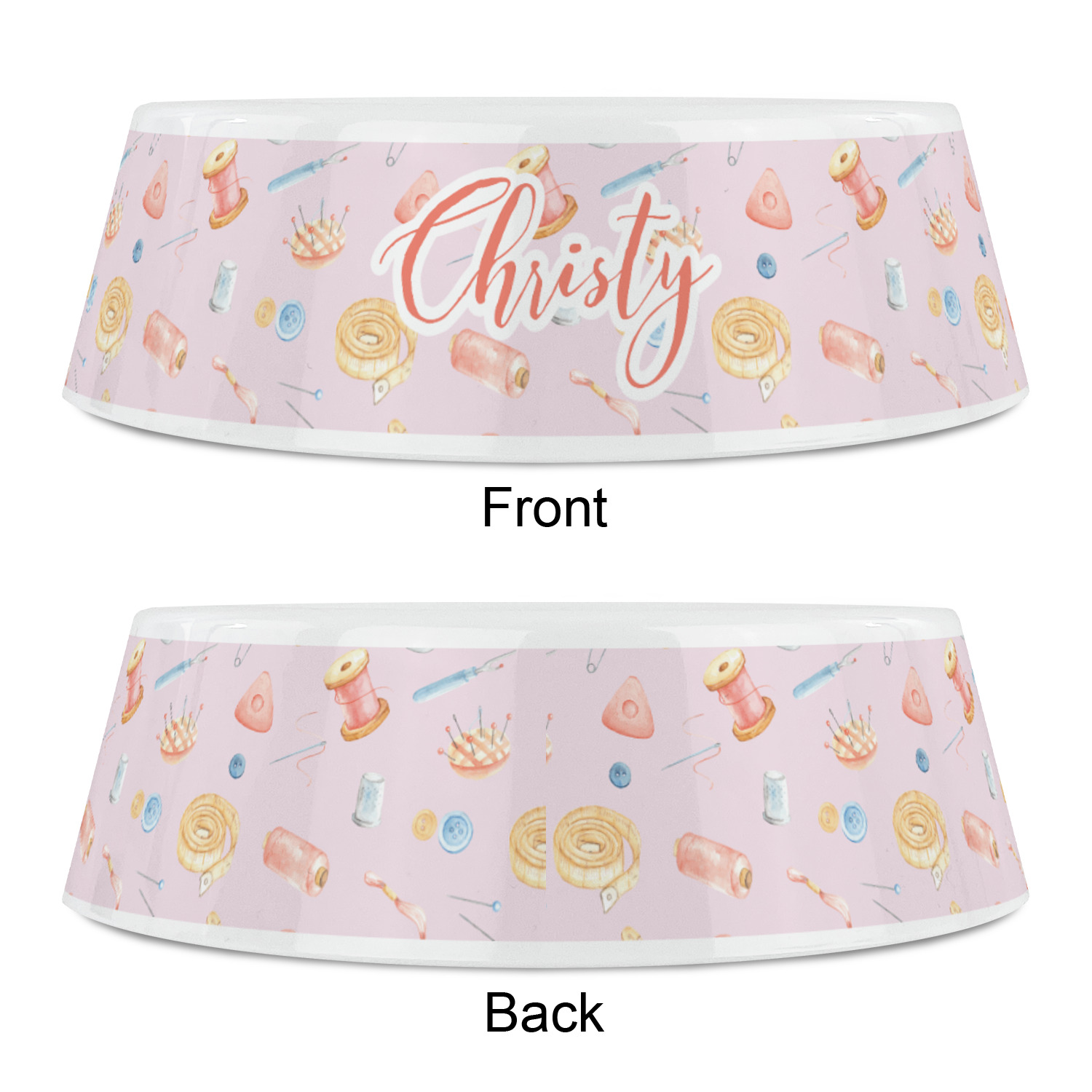 The design has a single pattern with a light pink background. The pattern is filled with sewing objects from needles to spools to pin cushions. The colors of the sewing objects include grey, light blue, peach, pink, and yellow. There are two ribbons going across the design that are a light grey-blue, accenting the similar color in the pattern. In between the two ribbons is where your personalization goes! On the coordinating design a textured grey-blue background is used, while a fun graphic of a pile of sewing items sits in the middle. Your personalization goes underneath.