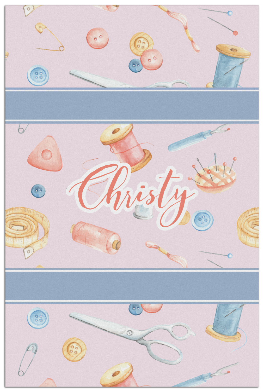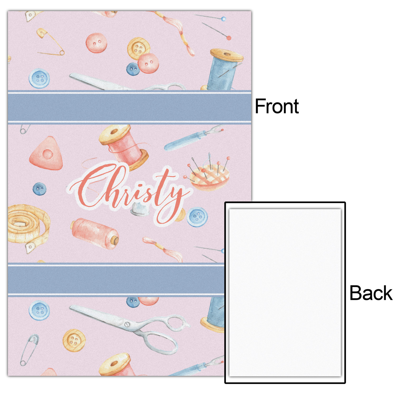 The design has a single pattern with a light pink background. The pattern is filled with sewing objects from needles to spools to pin cushions. The colors of the sewing objects include grey, light blue, peach, pink, and yellow. There are two ribbons going across the design that are a light grey-blue, accenting the similar color in the pattern. In between the two ribbons is where your personalization goes! On the coordinating design a textured grey-blue background is used, while a fun graphic of a pile of sewing items sits in the middle. Your personalization goes underneath.