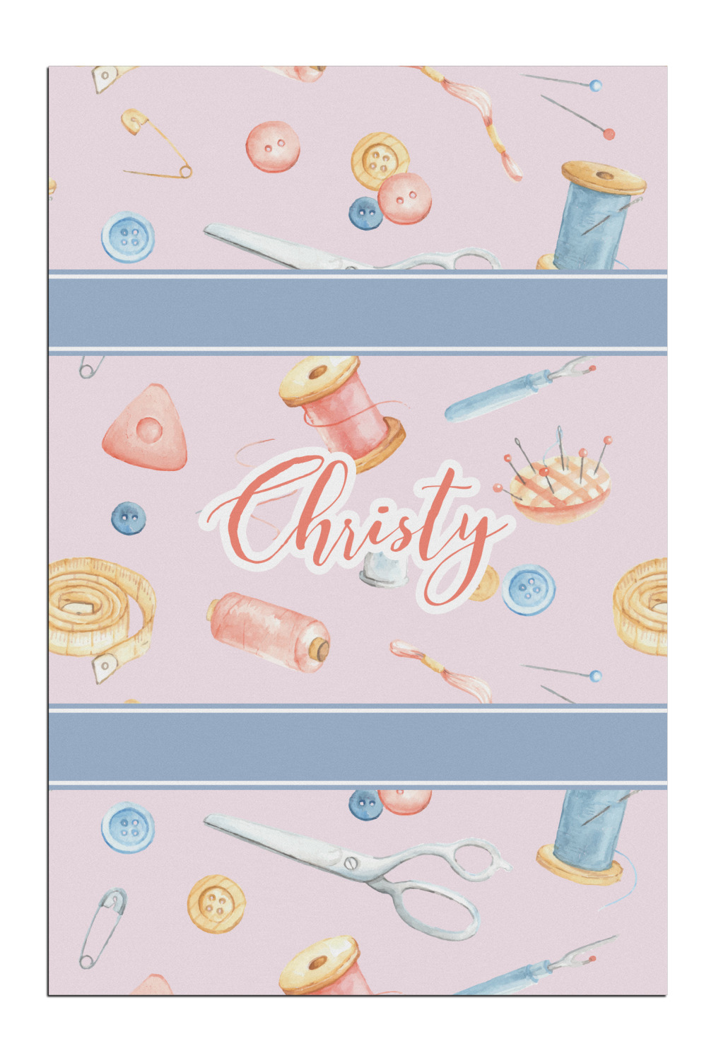 The design has a single pattern with a light pink background. The pattern is filled with sewing objects from needles to spools to pin cushions. The colors of the sewing objects include grey, light blue, peach, pink, and yellow. There are two ribbons going across the design that are a light grey-blue, accenting the similar color in the pattern. In between the two ribbons is where your personalization goes! On the coordinating design a textured grey-blue background is used, while a fun graphic of a pile of sewing items sits in the middle. Your personalization goes underneath.