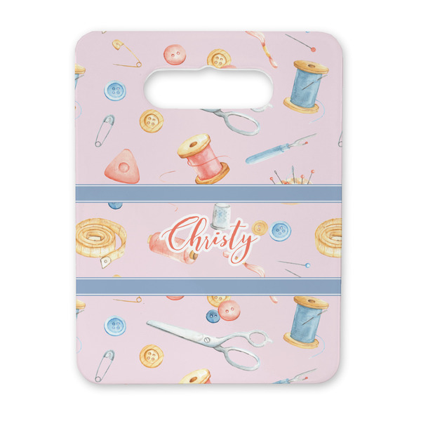 The design has a single pattern with a light pink background. The pattern is filled with sewing objects from needles to spools to pin cushions. The colors of the sewing objects include grey, light blue, peach, pink, and yellow. There are two ribbons going across the design that are a light grey-blue, accenting the similar color in the pattern. In between the two ribbons is where your personalization goes! On the coordinating design a textured grey-blue background is used, while a fun graphic of a pile of sewing items sits in the middle. Your personalization goes underneath.