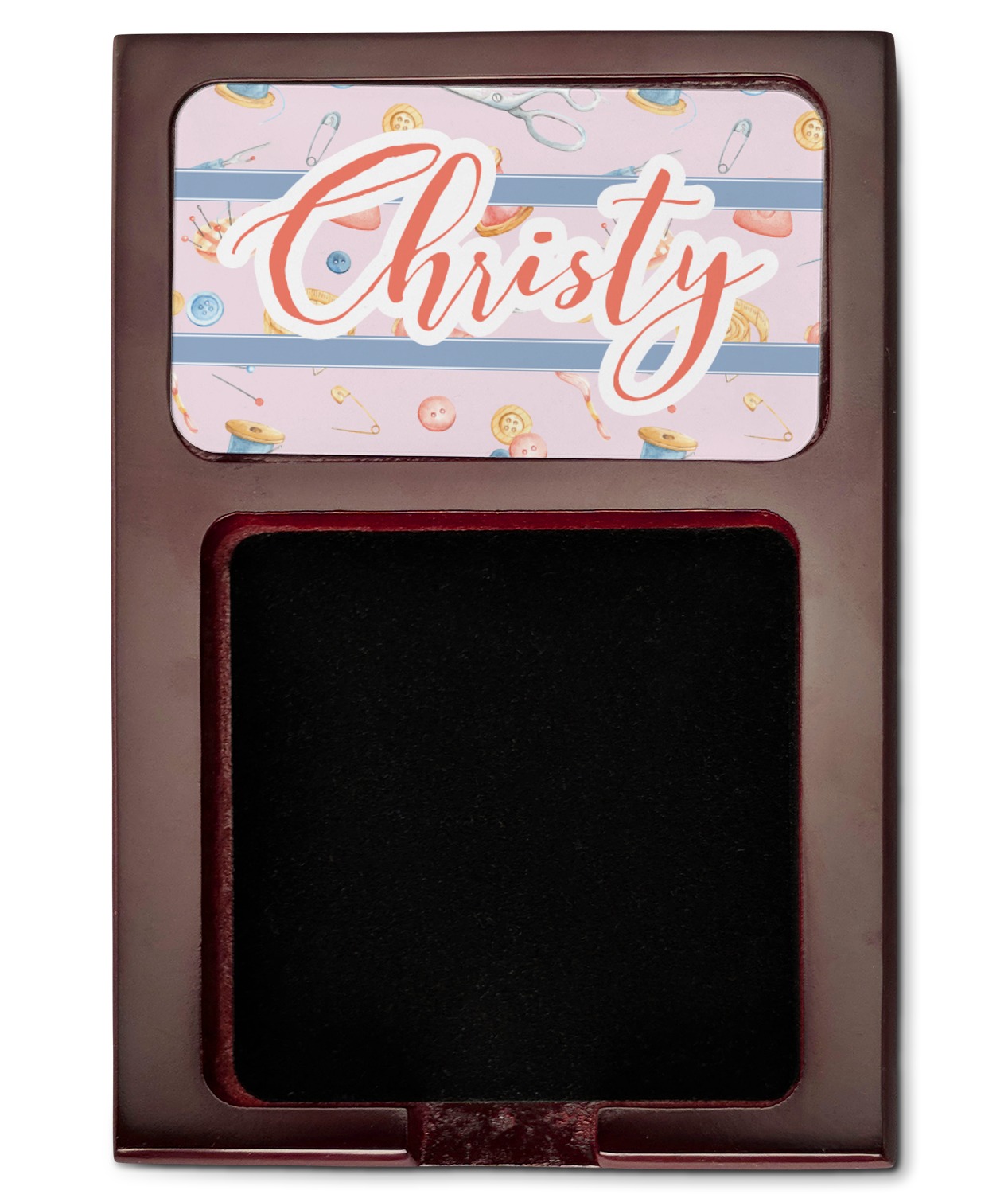 Crafted from a fine mahogany, this post it note holder is in the shade of a dark, cherry color. The dispenser itself is about 4.25 by 6.25 by 0.75 inches. You can place your 3 by 3 inch sticky notes in the indentation below the nameplate. We print your customization onto the nameplate that rests above the velvety indentation.