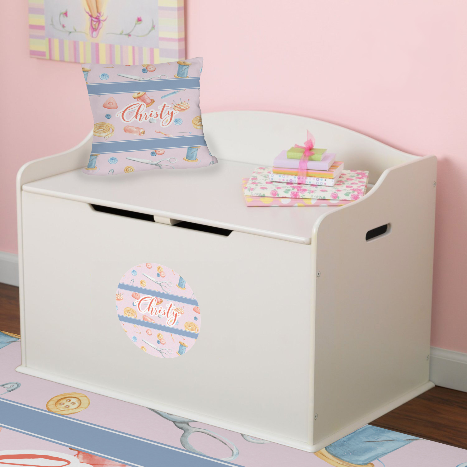 If you are a seamstress or just love sewing as a hobby, this design is for you! Help spruce up your sewing room with some accessories with this fun sewing pattern on it!