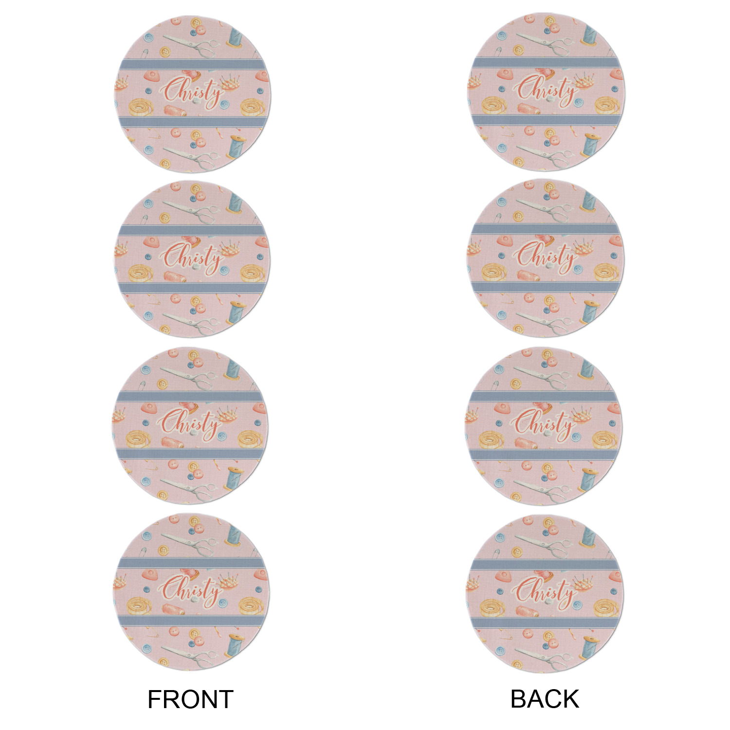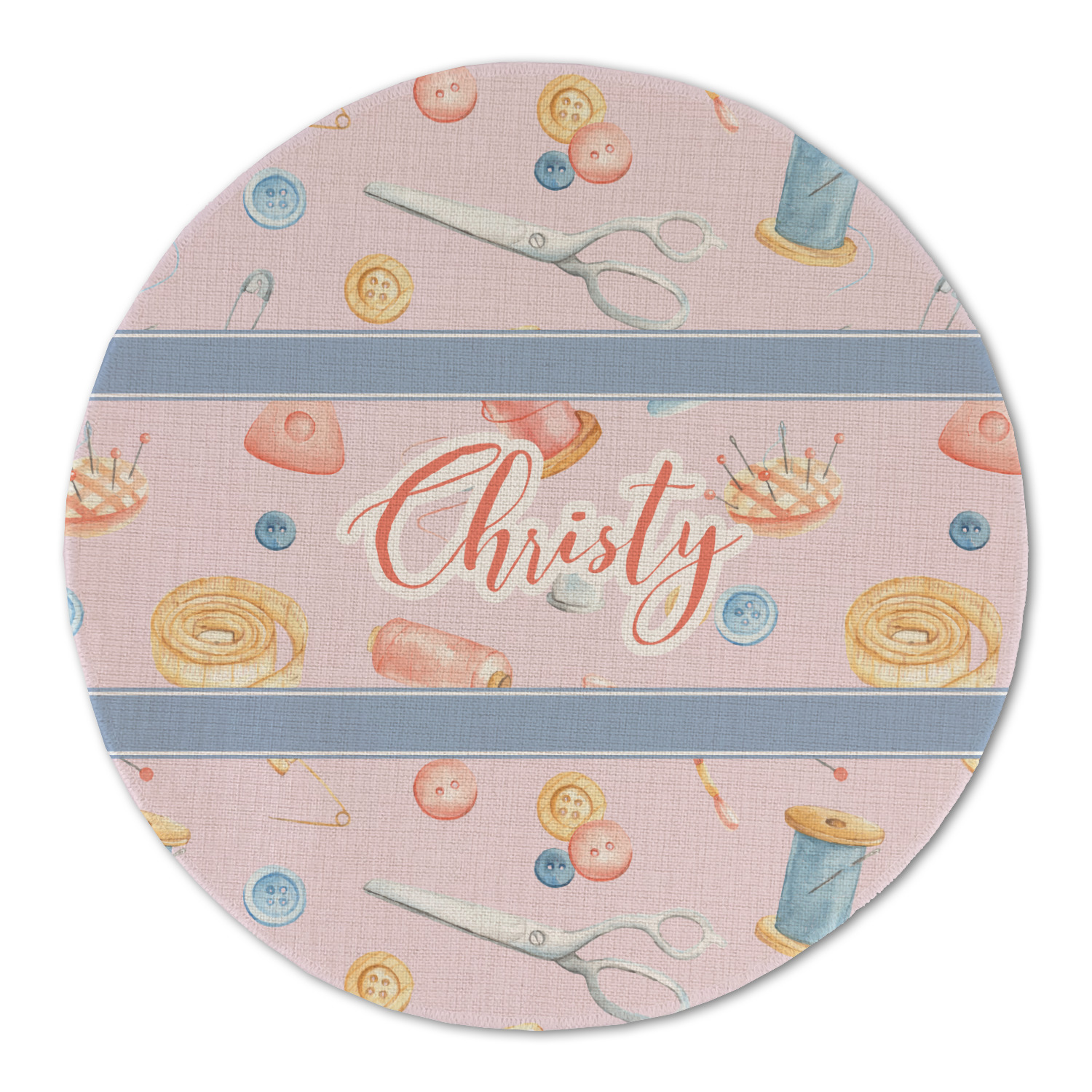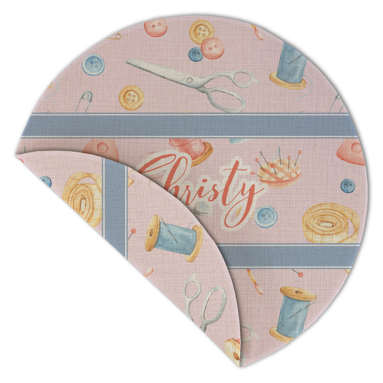 The design has a single pattern with a light pink background. The pattern is filled with sewing objects from needles to spools to pin cushions. The colors of the sewing objects include grey, light blue, peach, pink, and yellow. There are two ribbons going across the design that are a light grey-blue, accenting the similar color in the pattern. In between the two ribbons is where your personalization goes! On the coordinating design a textured grey-blue background is used, while a fun graphic of a pile of sewing items sits in the middle. Your personalization goes underneath.