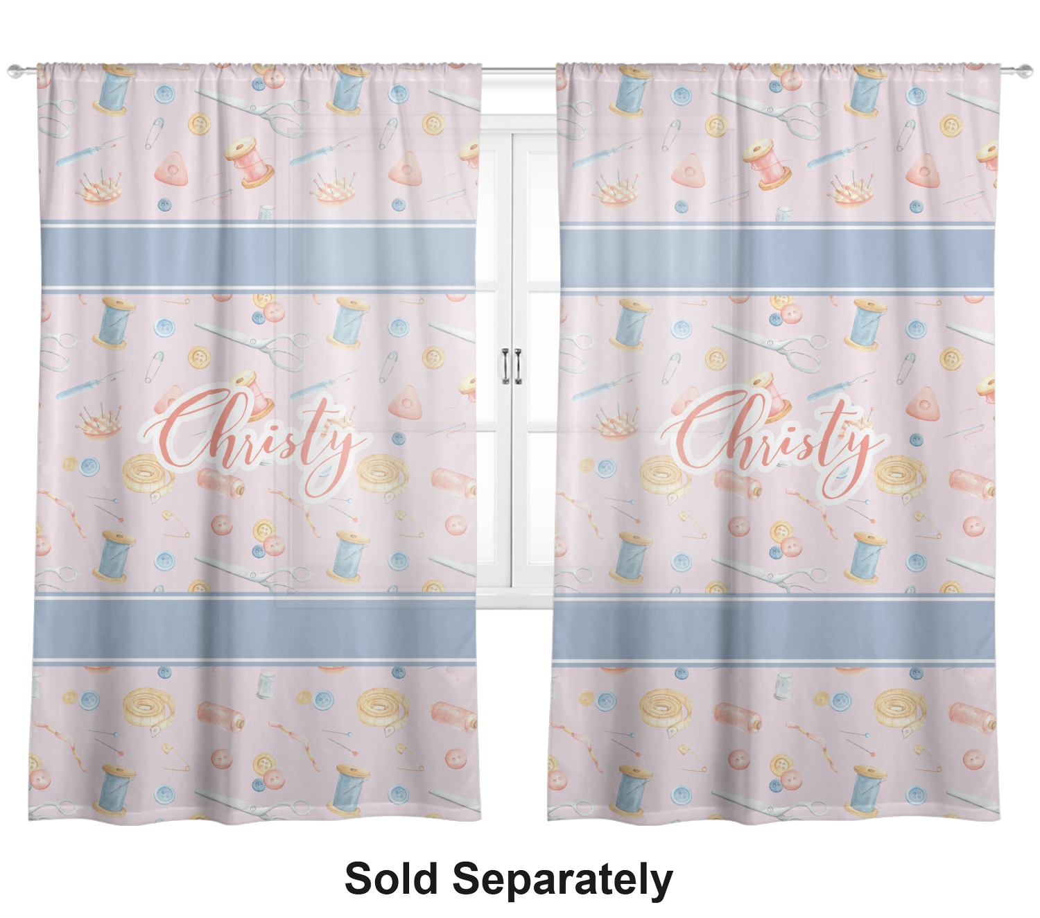 The design has a single pattern with a light pink background. The pattern is filled with sewing objects from needles to spools to pin cushions. The colors of the sewing objects include grey, light blue, peach, pink, and yellow. There are two ribbons going across the design that are a light grey-blue, accenting the similar color in the pattern. In between the two ribbons is where your personalization goes! On the coordinating design a textured grey-blue background is used, while a fun graphic of a pile of sewing items sits in the middle. Your personalization goes underneath.