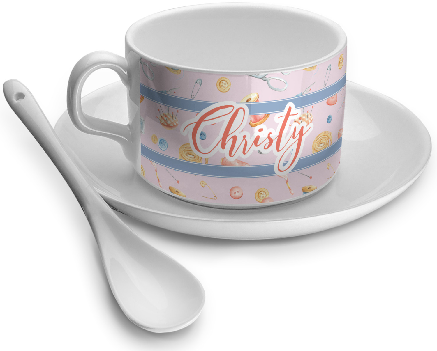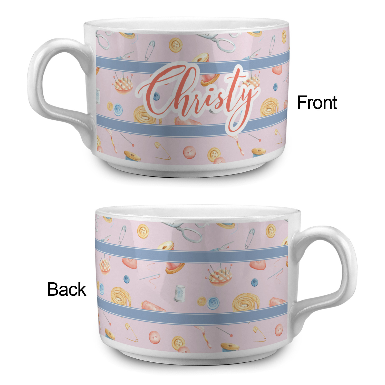 The design has a single pattern with a light pink background. The pattern is filled with sewing objects from needles to spools to pin cushions. The colors of the sewing objects include grey, light blue, peach, pink, and yellow. There are two ribbons going across the design that are a light grey-blue, accenting the similar color in the pattern. In between the two ribbons is where your personalization goes! On the coordinating design a textured grey-blue background is used, while a fun graphic of a pile of sewing items sits in the middle. Your personalization goes underneath.