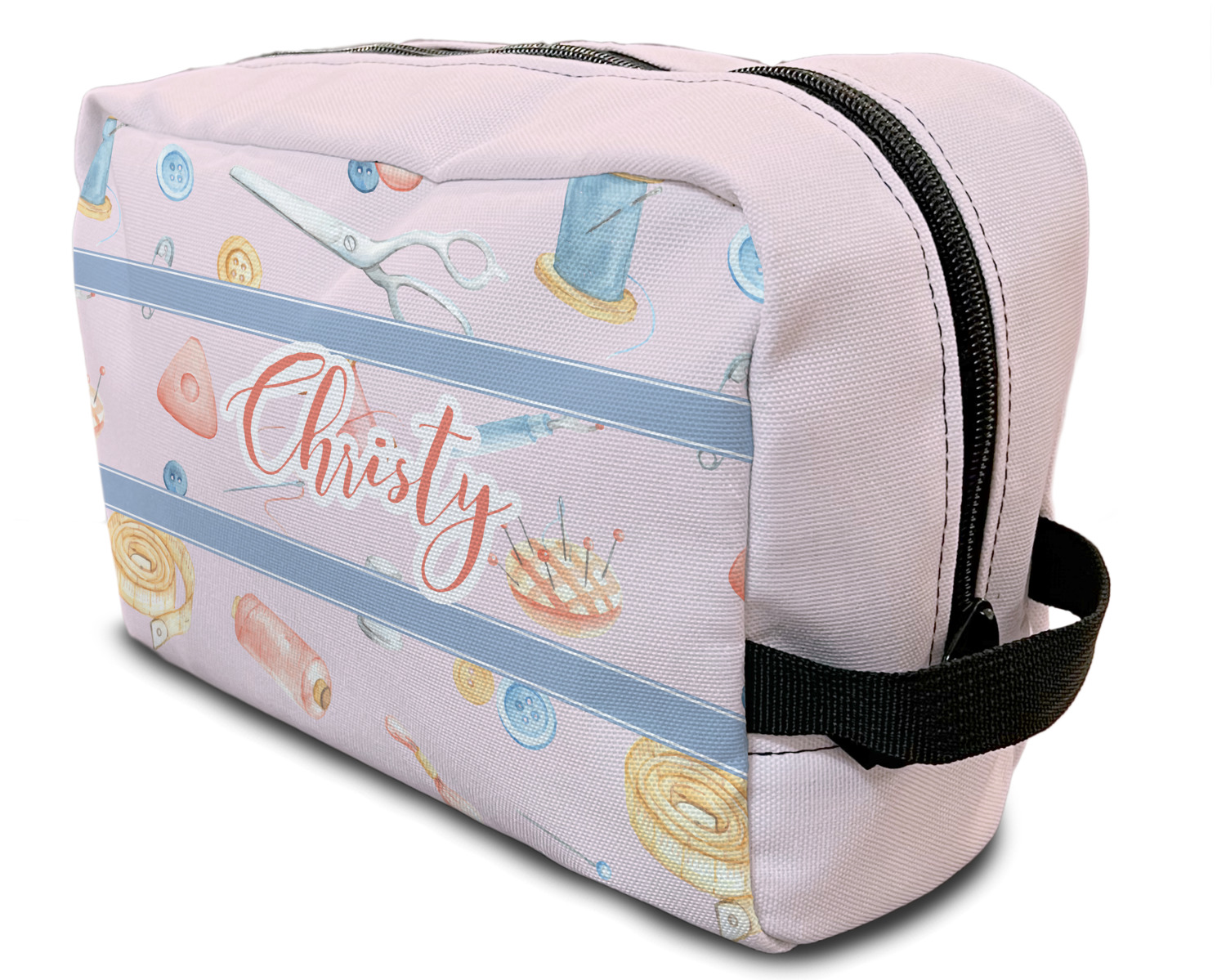 Our toiletry bag has the traditional dopp kit design i.e. a side to side zippered closure, giving you easy access to all the contents inside and a sturdy handle on one side of the bag. The canvas fabric for dopp kits is printed, then cut and sewn here in the USA.
