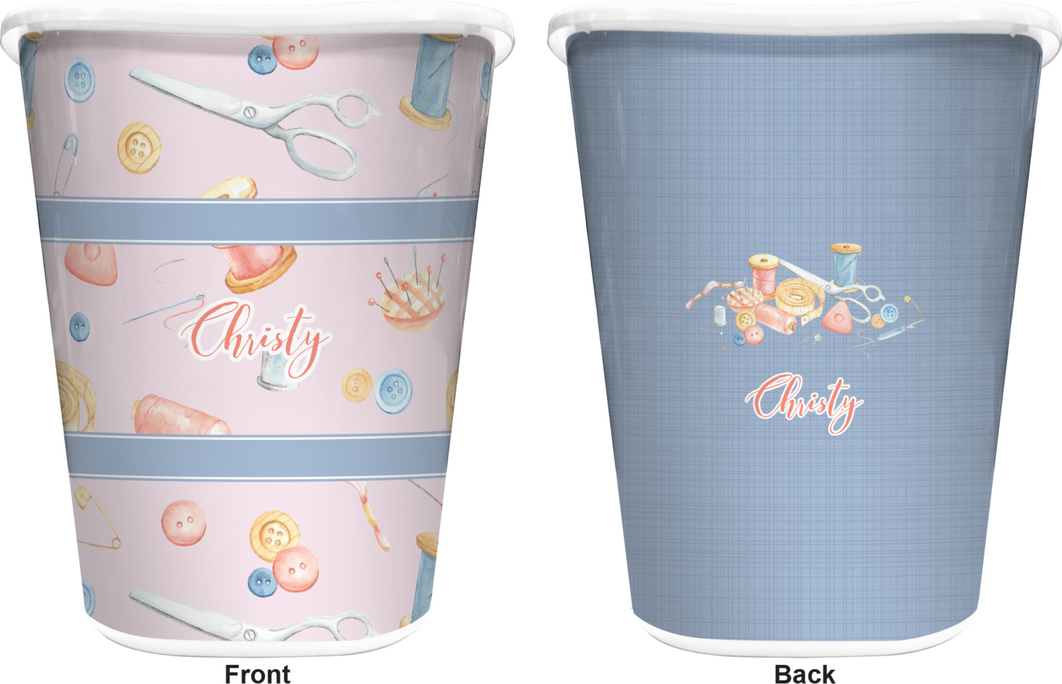 The design has a single pattern with a light pink background. The pattern is filled with sewing objects from needles to spools to pin cushions. The colors of the sewing objects include grey, light blue, peach, pink, and yellow. There are two ribbons going across the design that are a light grey-blue, accenting the similar color in the pattern. In between the two ribbons is where your personalization goes! On the coordinating design a textured grey-blue background is used, while a fun graphic of a pile of sewing items sits in the middle. Your personalization goes underneath.