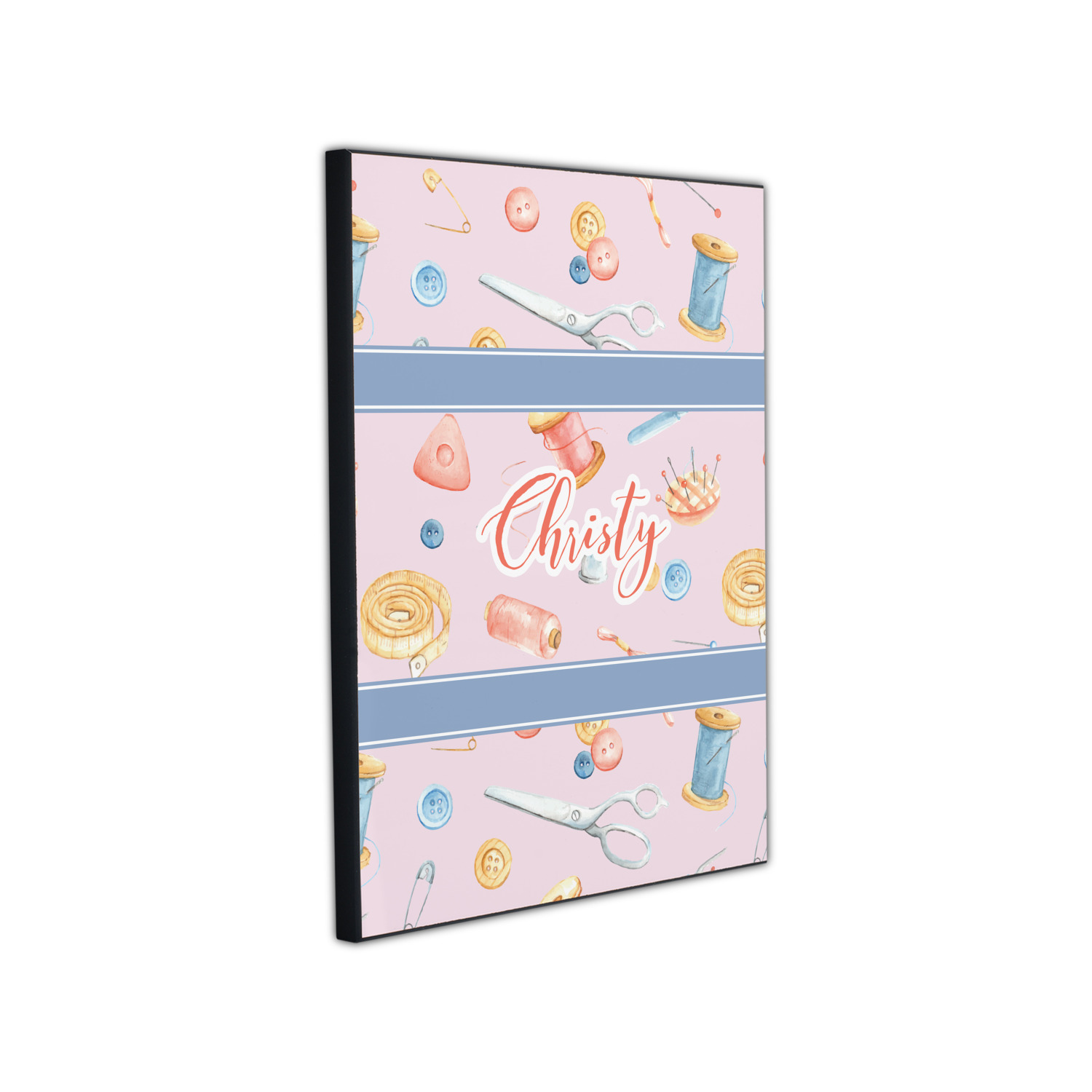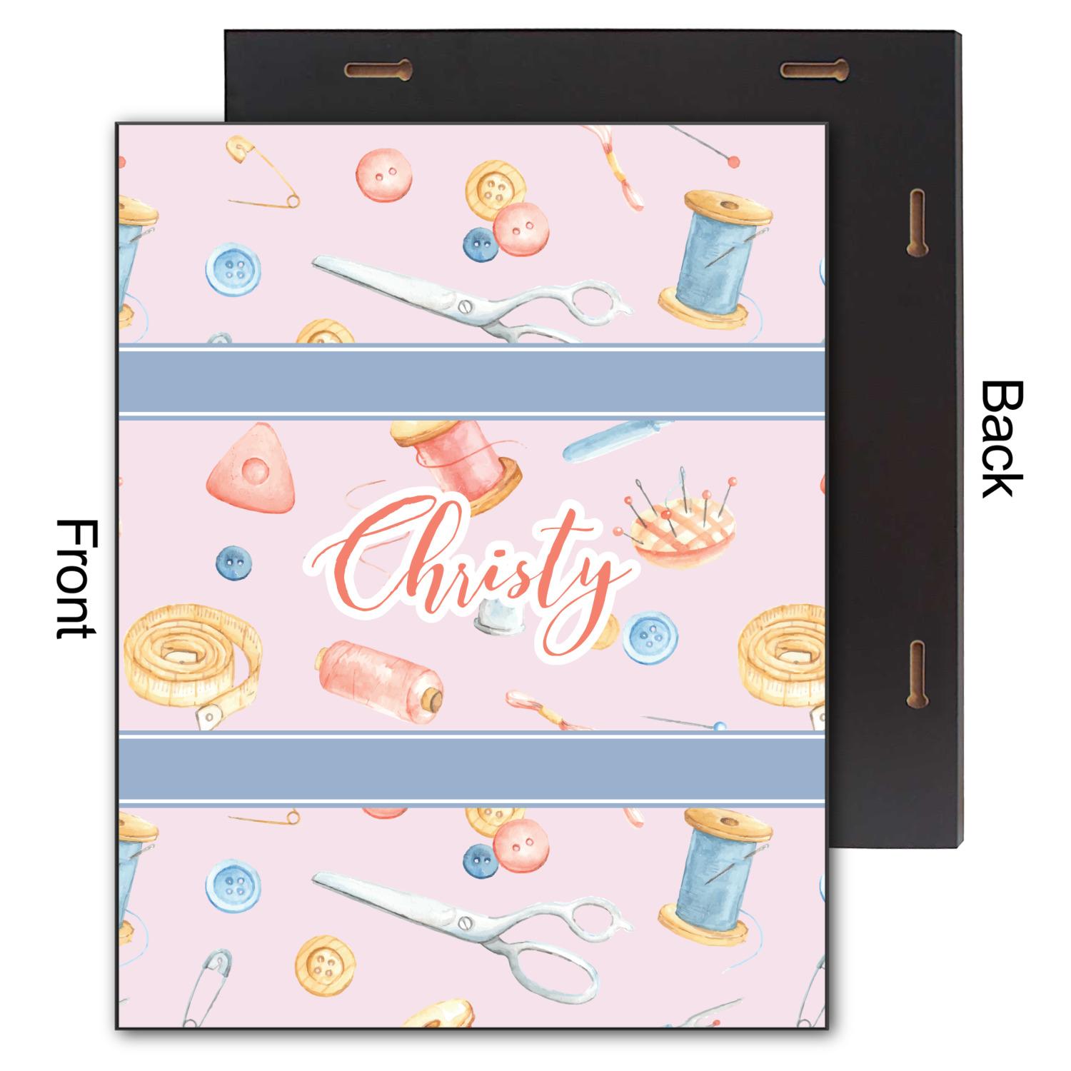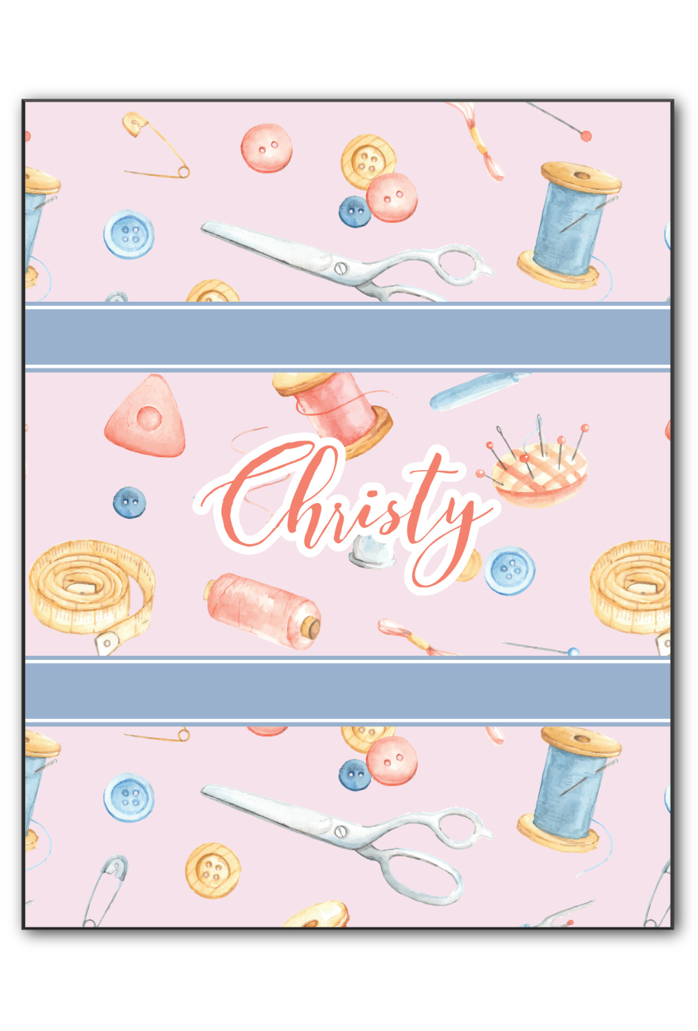 The design has a single pattern with a light pink background. The pattern is filled with sewing objects from needles to spools to pin cushions. The colors of the sewing objects include grey, light blue, peach, pink, and yellow. There are two ribbons going across the design that are a light grey-blue, accenting the similar color in the pattern. In between the two ribbons is where your personalization goes! On the coordinating design a textured grey-blue background is used, while a fun graphic of a pile of sewing items sits in the middle. Your personalization goes underneath.