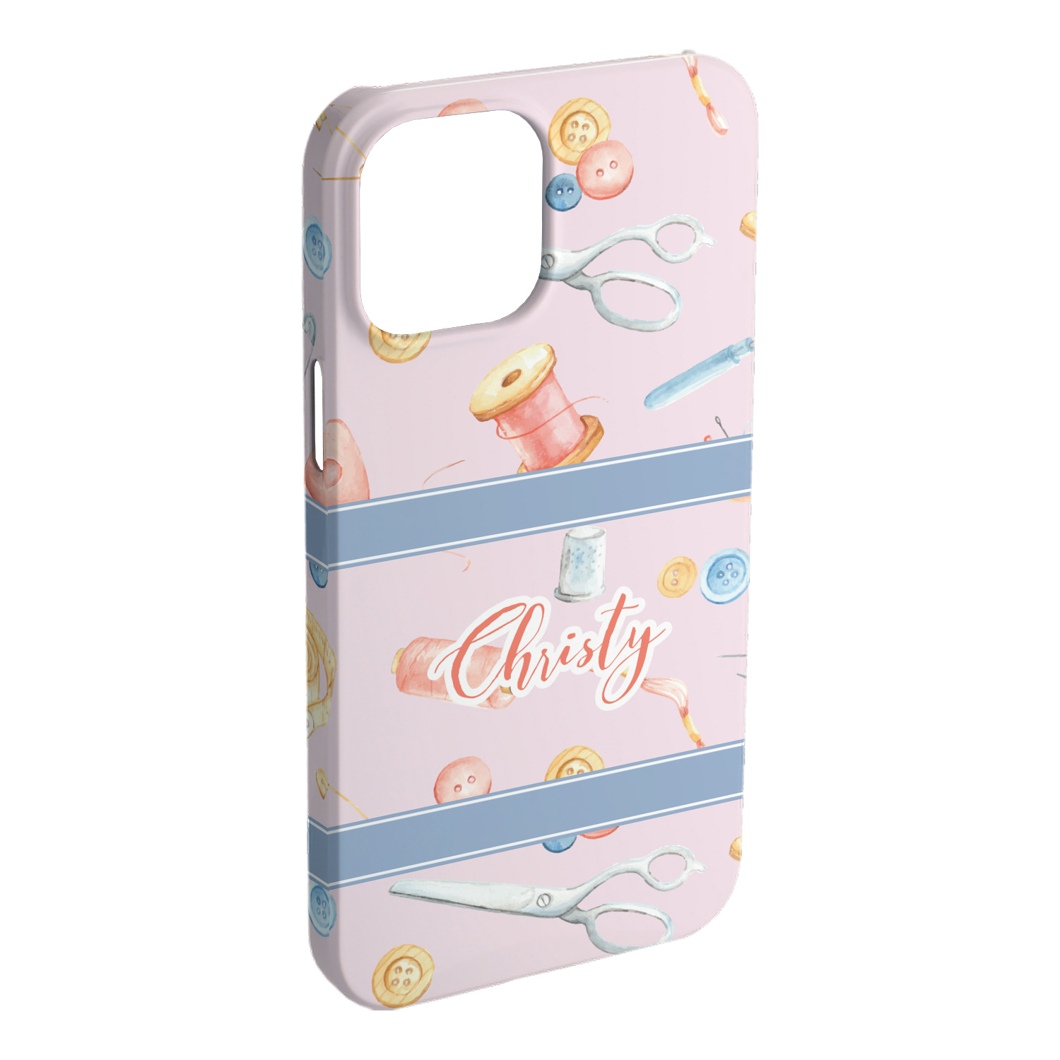 The design has a single pattern with a light pink background. The pattern is filled with sewing objects from needles to spools to pin cushions. The colors of the sewing objects include grey, light blue, peach, pink, and yellow. There are two ribbons going across the design that are a light grey-blue, accenting the similar color in the pattern. In between the two ribbons is where your personalization goes! On the coordinating design a textured grey-blue background is used, while a fun graphic of a pile of sewing items sits in the middle. Your personalization goes underneath.