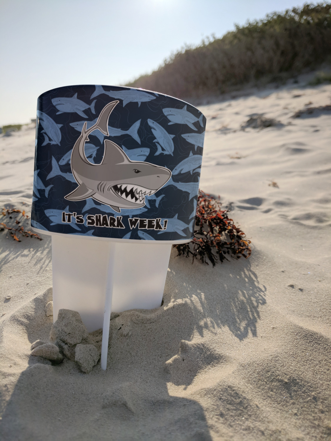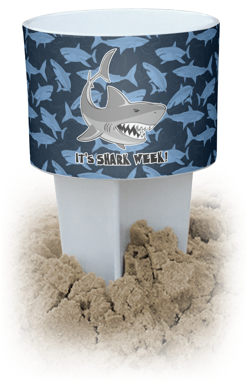 This cup holder has a large stake at its bottom that anchors it to the sand or ground below, while the cup holder rests above the stake. The entire drink holder is made of durable plastic and displays your customization around the cup holder portion. We sell these personalized beach spikers in two different colors: black and white.