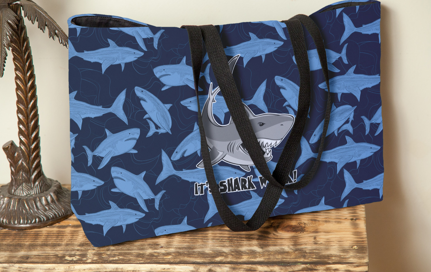 These beach totes are handmade here in the USA. Fabric is printed with your design. The tote is then sewn from the fabric pieces, lining and handles added.