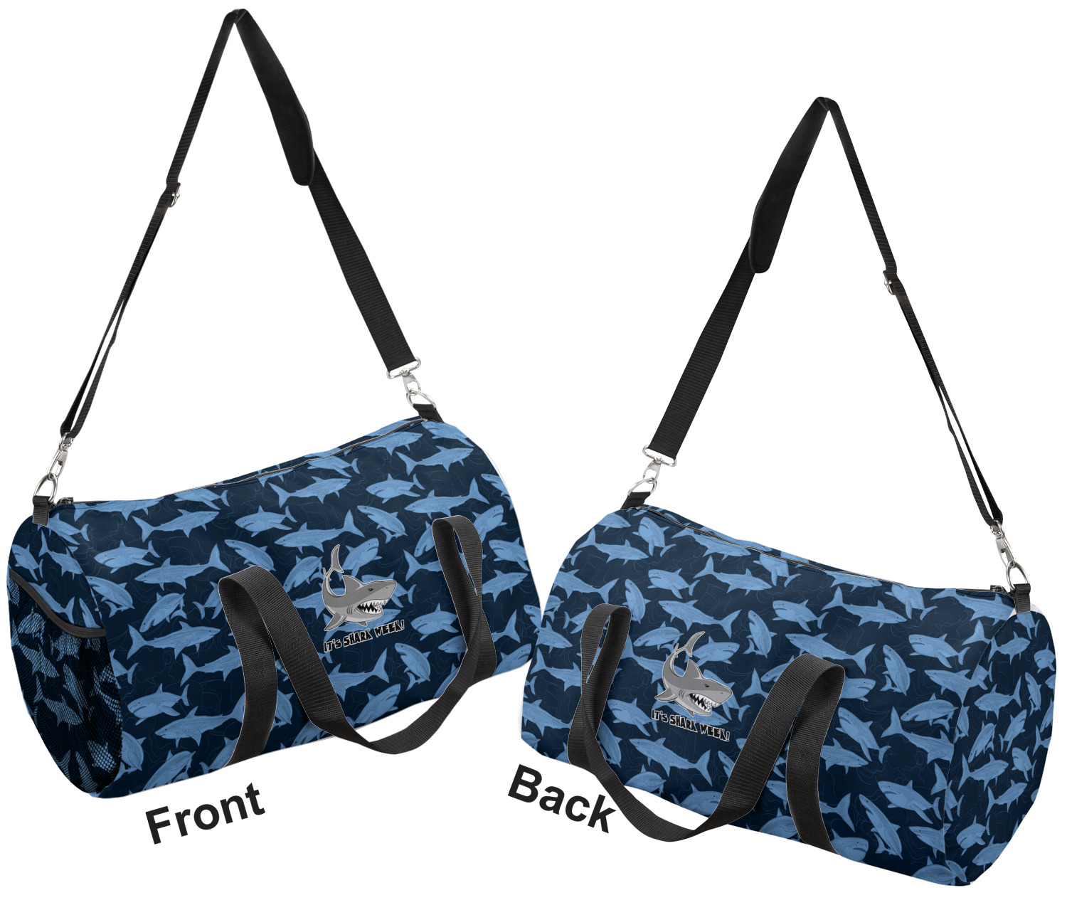 This duffle is a sturdy bag made of a canvas material. It comes in two sizes: Small (19"W x 9.5"H x 9.5"D) and Large (23"W x 12"H x 12"D). The bag is a cylindrical shape with a black adjustable strap and two handles. On one side is an elastic pouch to put a waterbottle or other small item. Your product will be sublimated with your design and is able to be designed on the front, back, and sides. Be sure to remember that the straps may cut into parts of your design if you upload your own artwork.