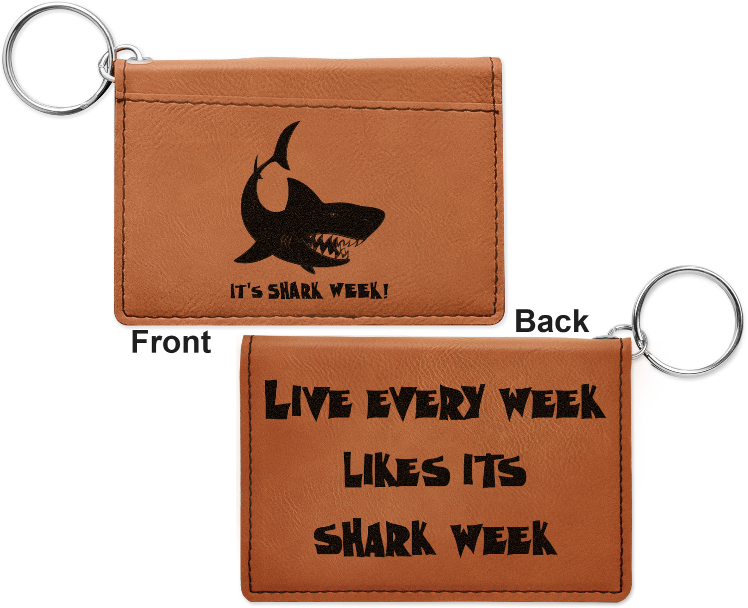 These ID wallet keychains features three pockets on the inside to accommodate your ID and your most frequently used cards. Another pocket occupies the front of the wallet's exterior, and can hold some cash or another card. The wallet is accompanied by a thick metal ring for easy attachment to a belt clip or purse. Each card holder keychain measures at 4.25 by 3 inches and is a beautiful, cognac, medium-brown shade. The personalized monogram, font, or graphic of your choosing is laser engraved into the surface of the wallet, creating a black imprint. We sell these ID wallets in two models: single sided and double sided engraving.